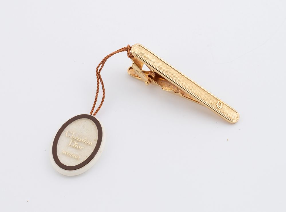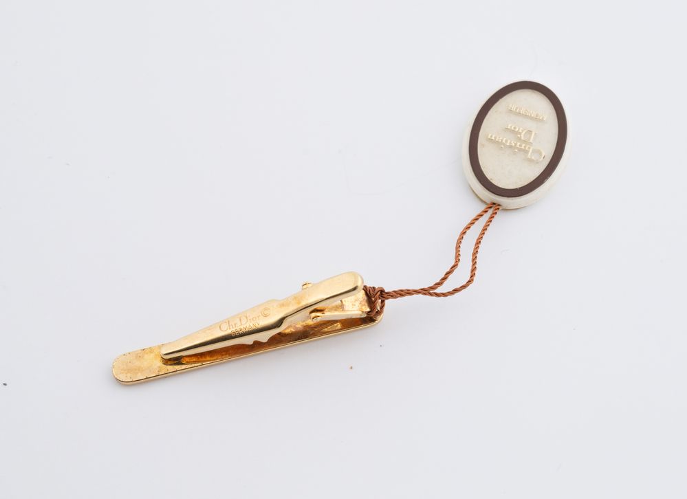 CHRISTIAN DIOR Fermacravatte in metallo dorato con logo Dior. Cm 5. Al retro...