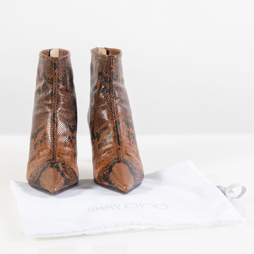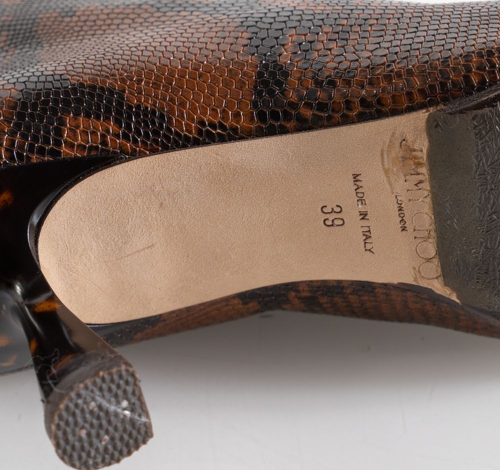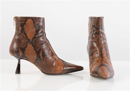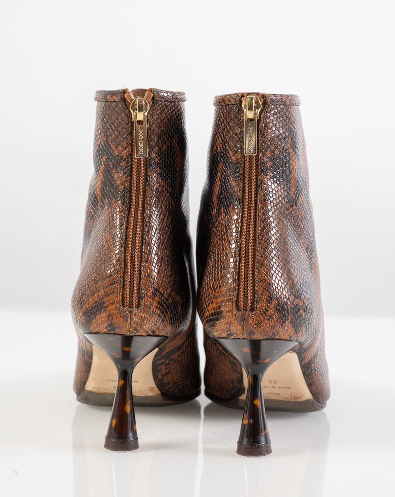 JIMMY CHOO Stivali tronchetto modello Kix in pelle effetto pitone. Modello a punta. Tacco in resina effetto tartaruga. Taglia 39. Tacco cm 6,5. Recano marchio Jimmy Choo, Made in Italy. Corredati da dustbag.