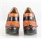 PRÊT A DANCER Scarpe con tacco in pelle marrone con dettagli in pelle arancione. Taglia 38. Tacco cm 9. Reca marchio Prêt a dancer, Made in Italy. Corredate da scatola.