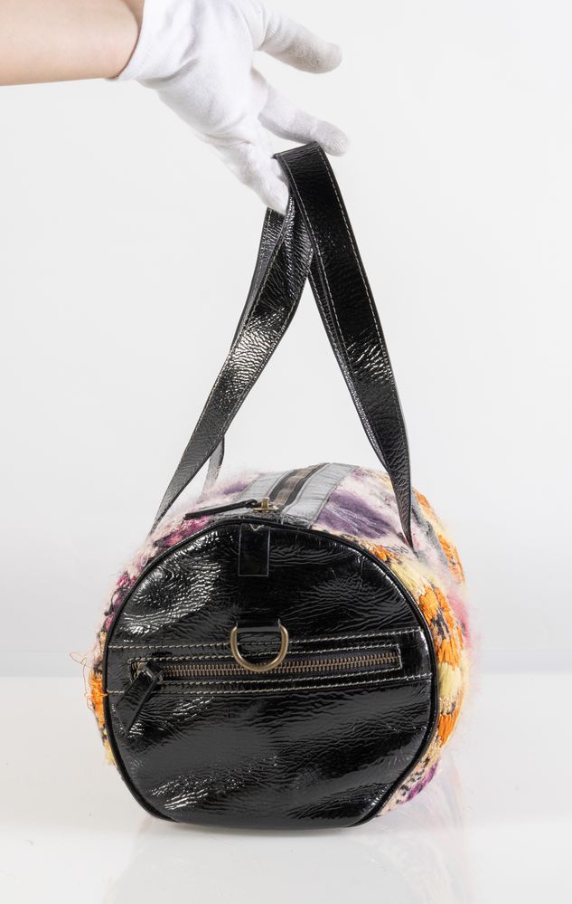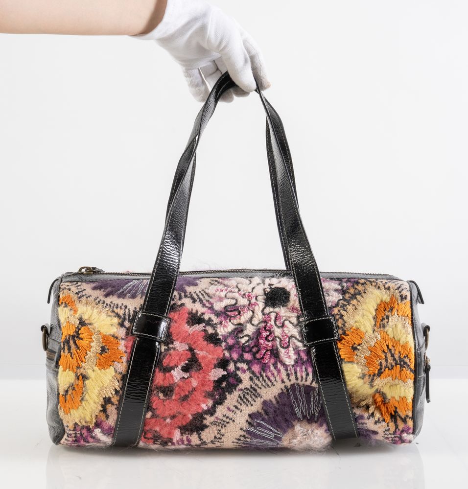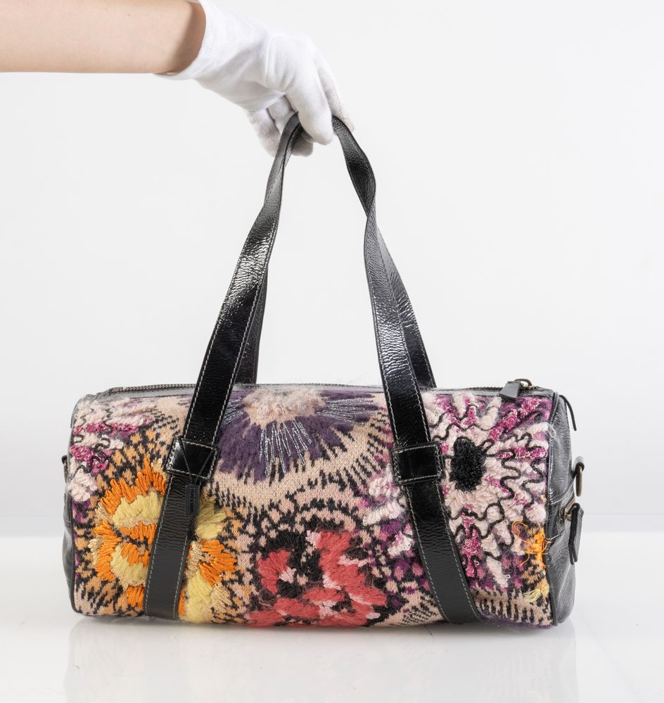 MISSONI Borsa a bauletto in tessuto a fantasia con dettagli in pelle nera. Cm 17x40x20; altezza con manici cm 43. Reca marchio Missoni.