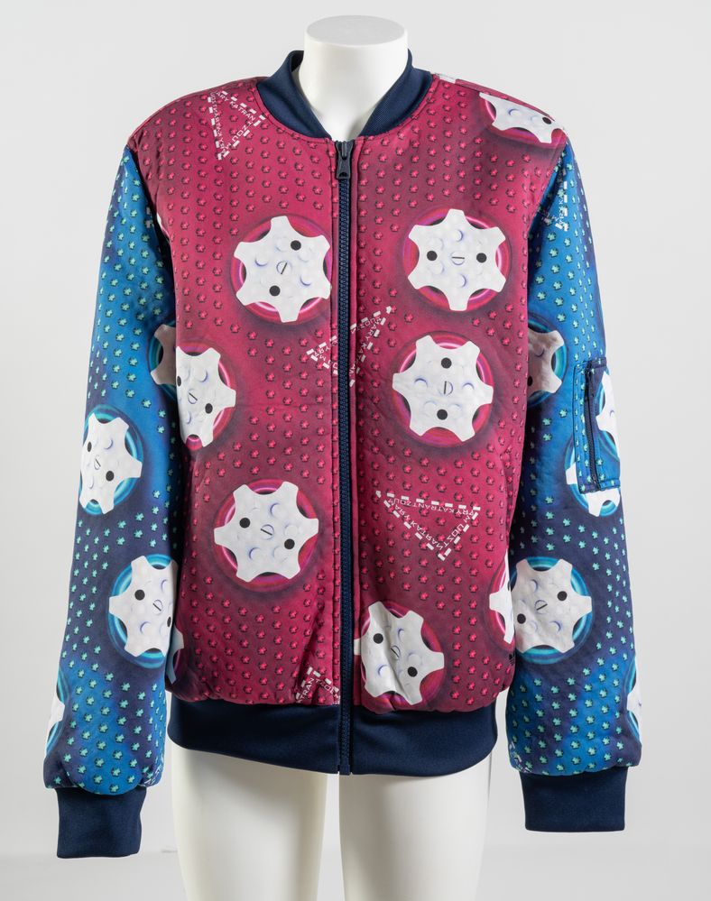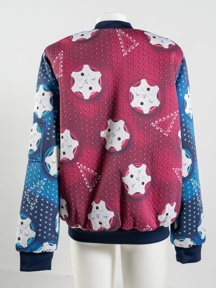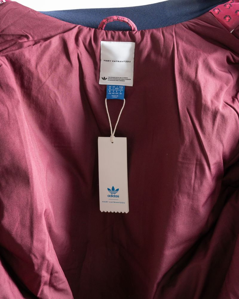 MARY KATRANTZOU X ADIDAS Giacca bomber imbottita a fantasuia sui toni del bordeaux, blu e bianco. Collezione 2014. Taglia IT 50. Composizione 100% poliestere. Reca marchio, etichetta e cartellino Mary Katrantzou Adidas.
