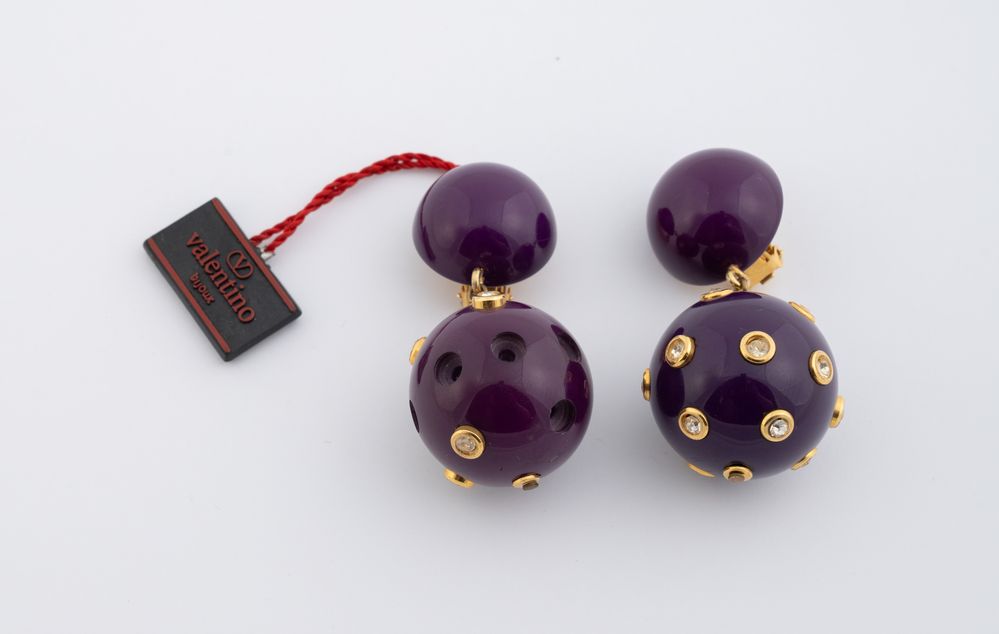 VALENTINO Orecchini a clip pendenti formati da due sfere viola con applicazioni di brillantini. Cadauno di cm 5,5x3. Recano etichetta Valentino Bijoux. (difetti e mancanze)