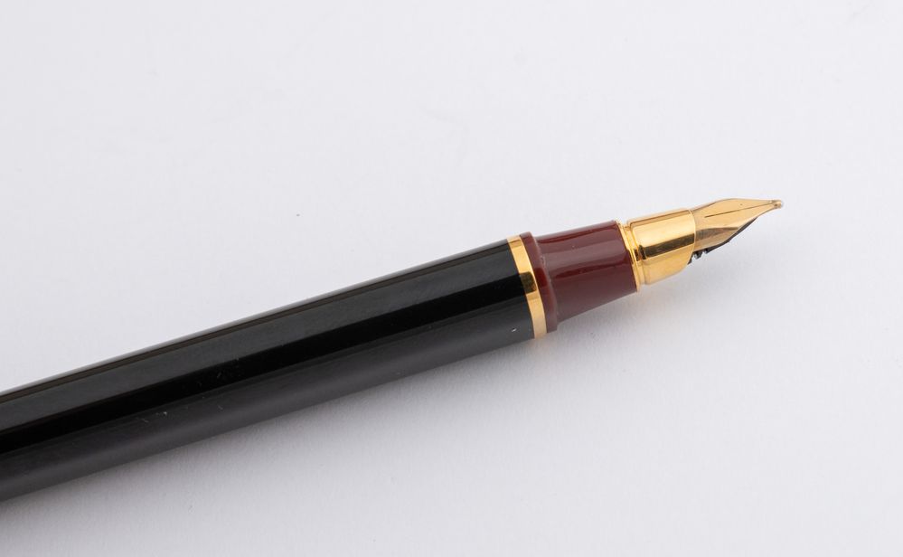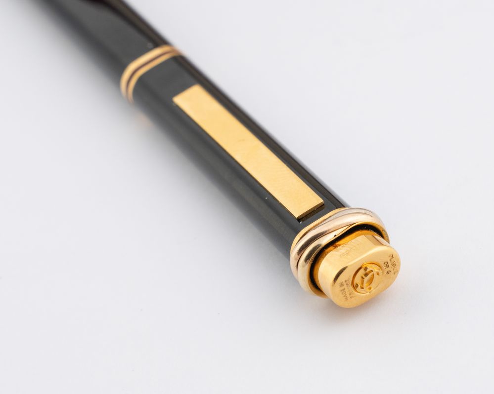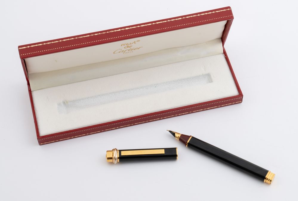 MUST DE CARTIER Penna stilografica modello Vendome Trinity Oval. Fusto in lacca nera con finiture bordeaux e in metallo placcato oro. Lunghezza cm 14. Reca marchi Cartier Paris, Made in France e codice di riferimento prodotto. Corredato da scatola.