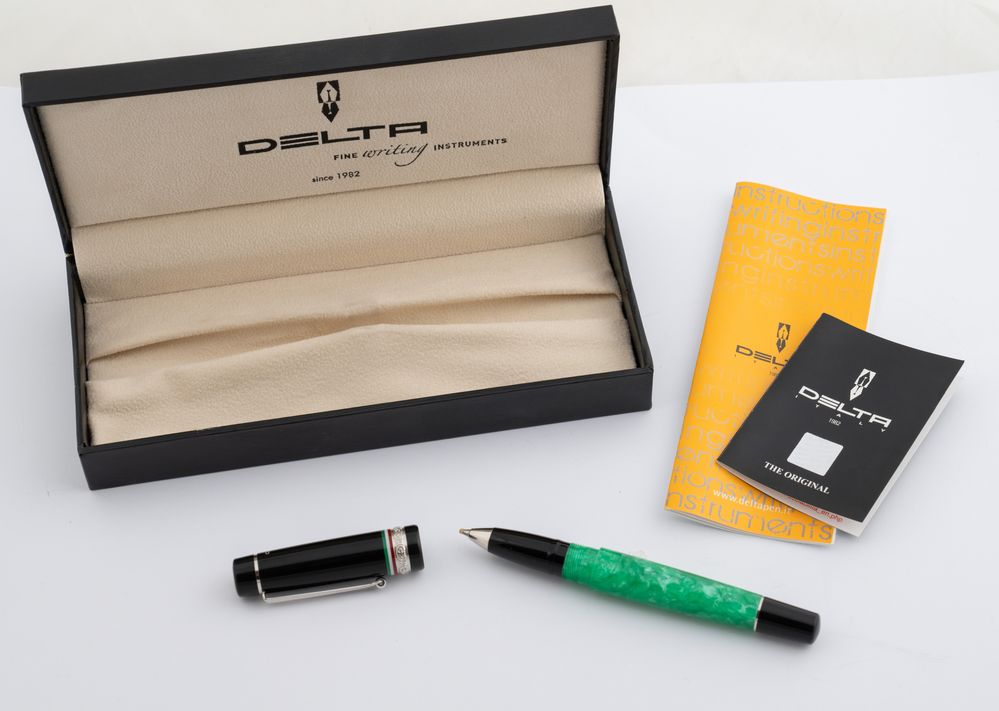 DELTA Penna a sfera in resina verde e nera con finiture in metallo argentato. Lunghezza cm 12. Reca marchio Delta Italy. Corredata da scatola, controscatola e garanzia di autenticità.