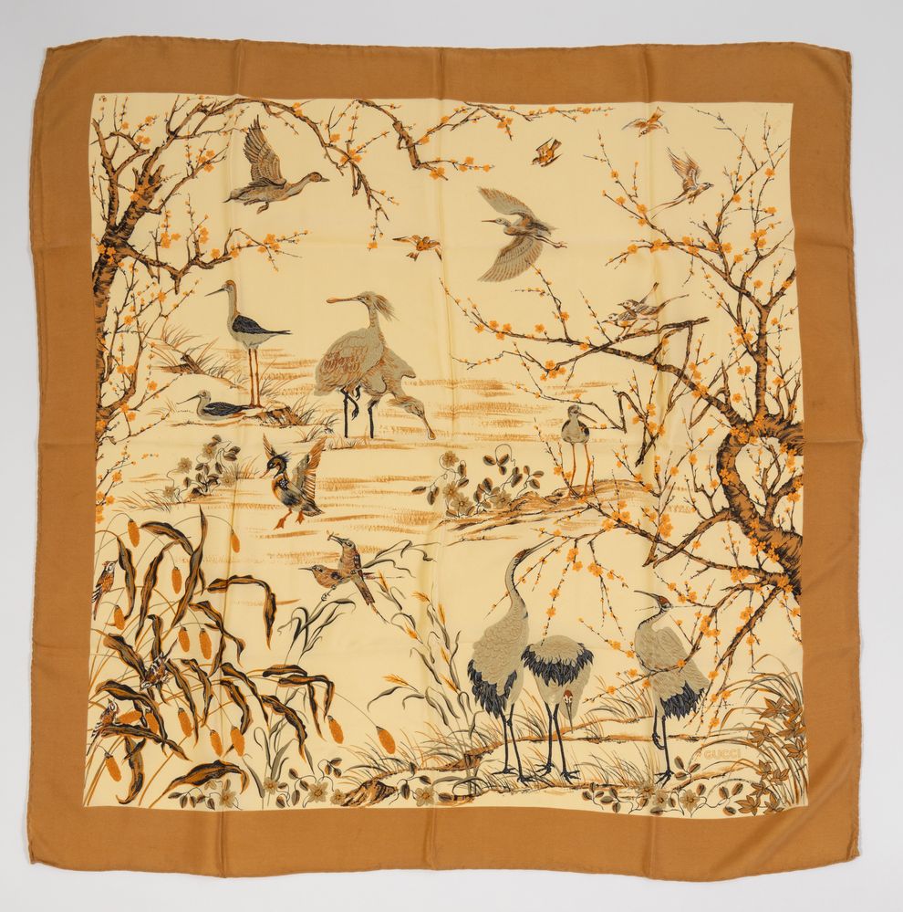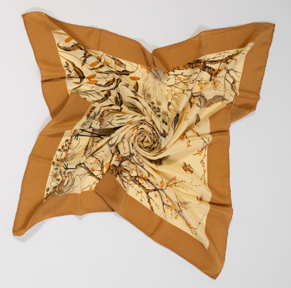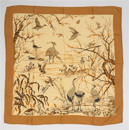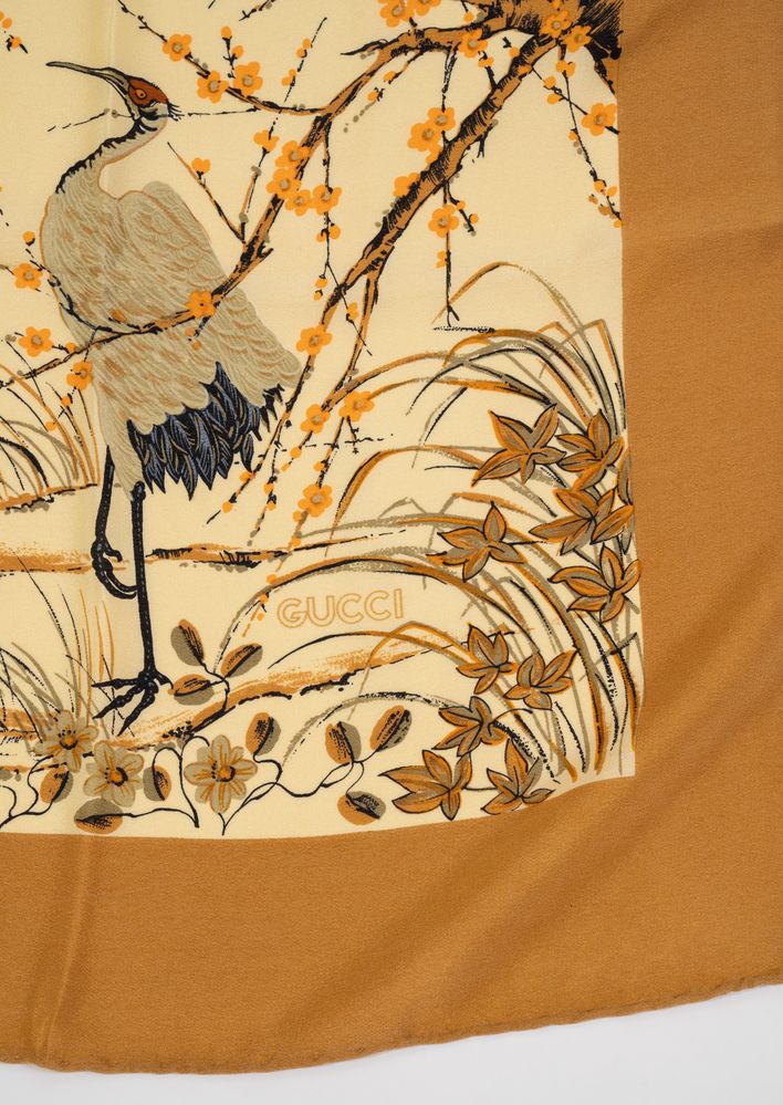 GUCCI Foulard in seta a fantasia floreale con uccelli sui toni dell'avorio, beige e arancione. Cm 84x84. Composizione 100% seta. Reca marchio Gucci. (lievi difetti)