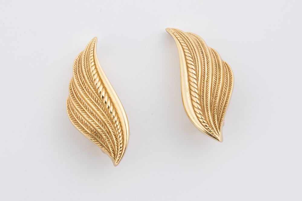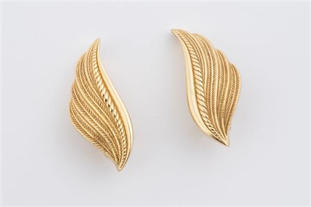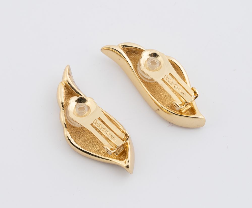 CHRISTIAN DIOR Orecchini a clip con motivi fogliacei in metallo dorato. Cadauno di cm 4,5x2. Recano marchio Chr.Dior Germany e cartellino Christian Dior.