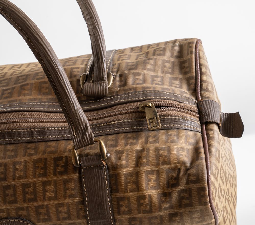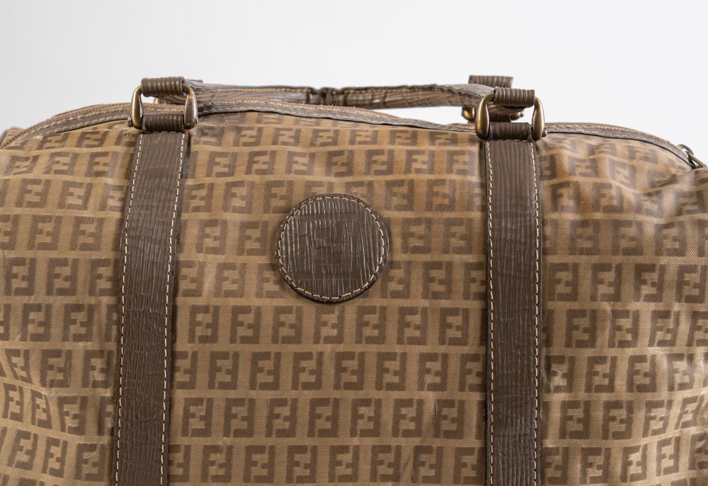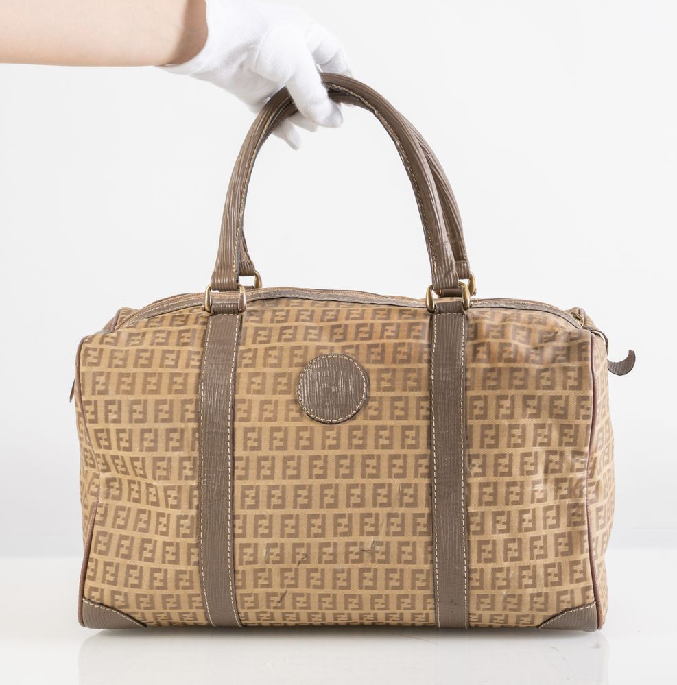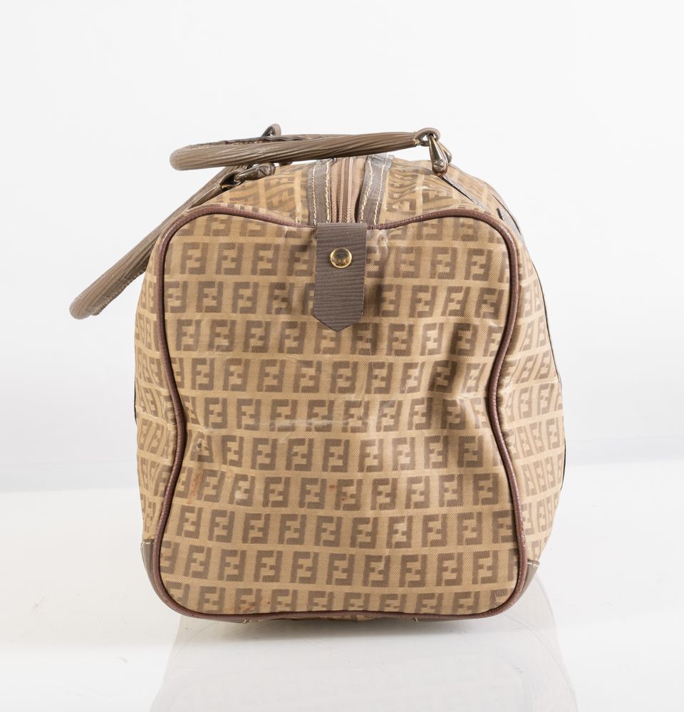 FENDI Borsa a bauletto in tela Zucchino monogram e finiture in pelle nocciola. Cm 21x37x19; altezza con manici cm 36. Reca marchi FF ed etichetta FF Fendi sas, Roma, Made in Italy. (difetti)
