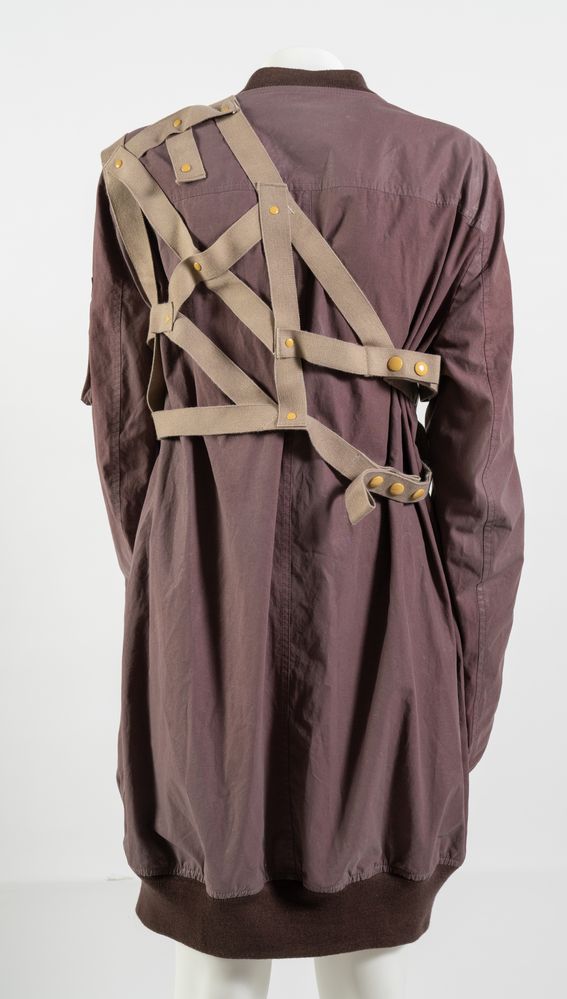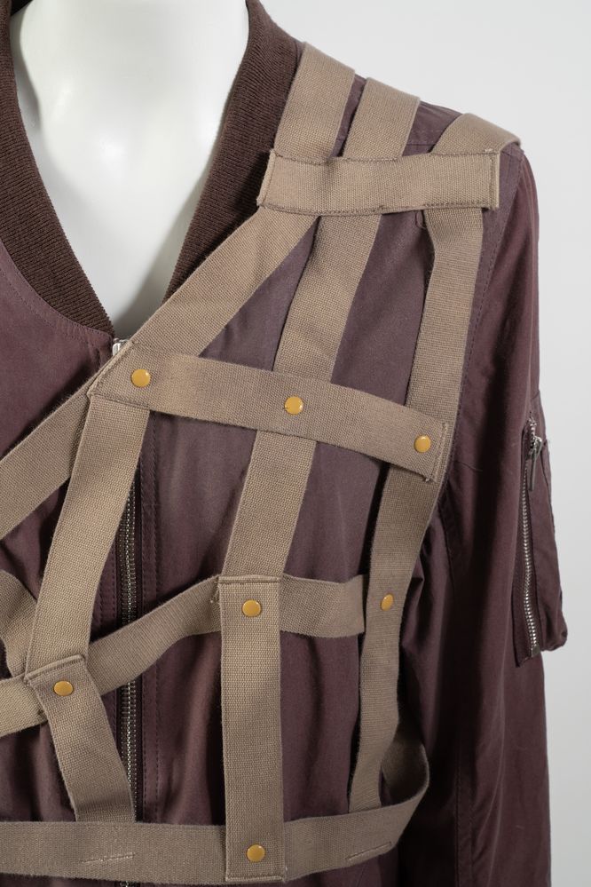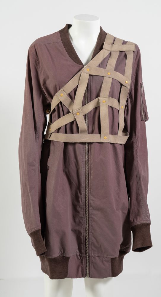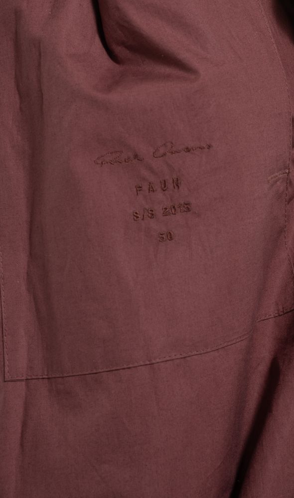 RICK OWENS Giacca lunga a bomber sui toni del bordeaux con applicazione in cotone beige. Collezione Spring / Summer 2015. Taglia IT 50. Composizione 100% cotone. Reca marchio Rick Owens.