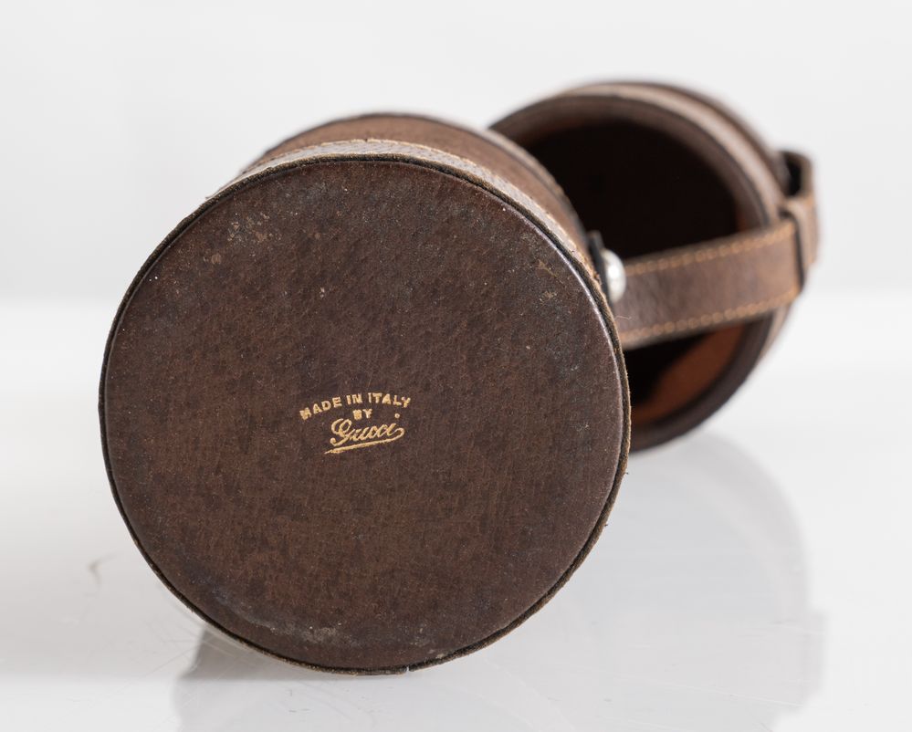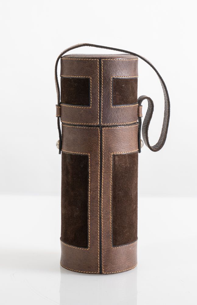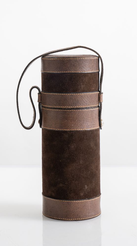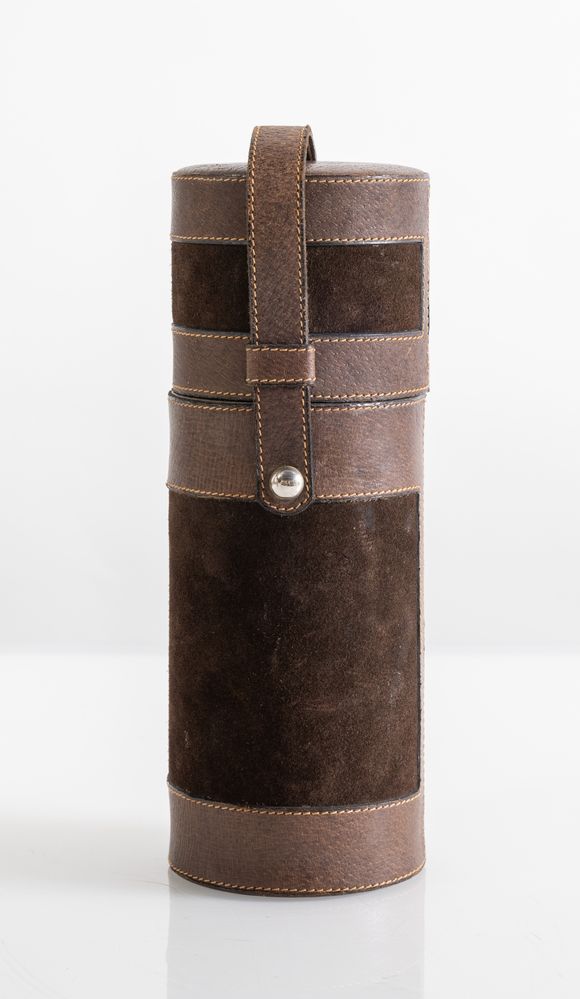 GUCCI Porta bottiglia in pelle e camoscio marrone. Cm 25x9; manico cm 50. Dettagli in metallo dorato. Reca marchio Made in Italy by Gucci.