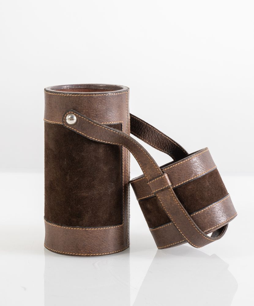GUCCI Porta bottiglia in pelle e camoscio marrone. Cm 25x9; manico cm 50....