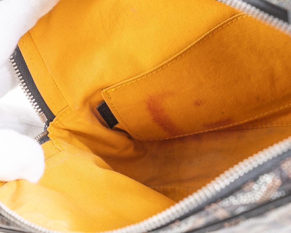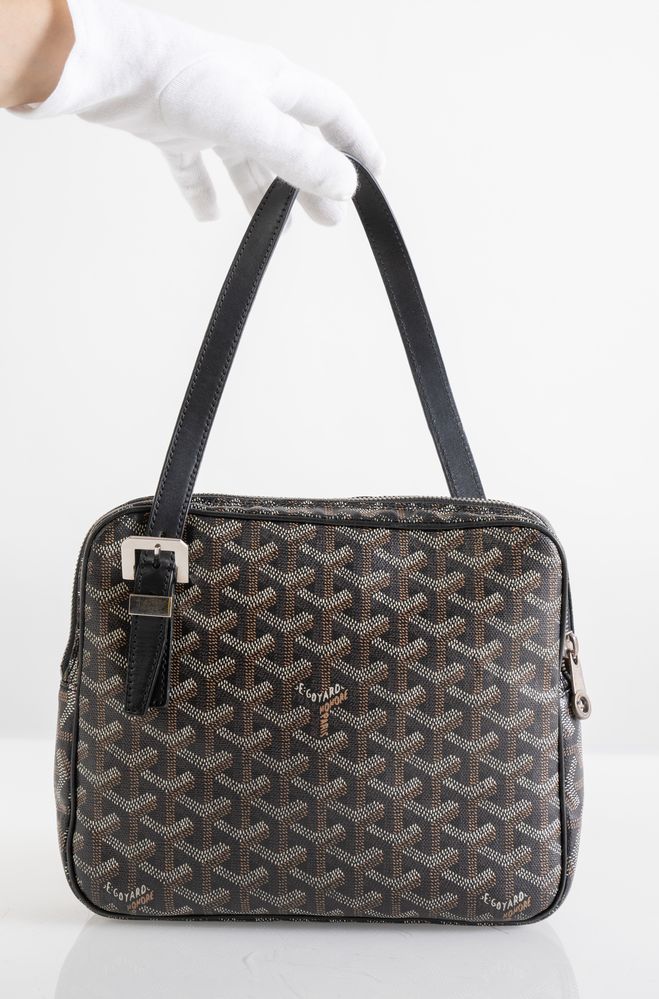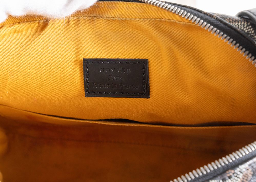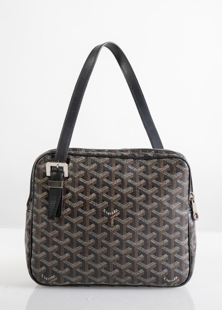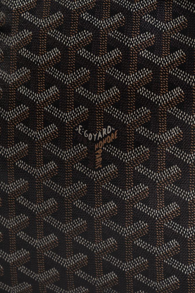 GOYARD Borsa modello Yona MM in tela monogram Chevron sui toni del nero, marrone e bianco con manico regolabile in pelle nera. Cm 20x24x5; manico lunghezza totale cm 60. Dettagli in metallo argentato. All'interno reca una tasca. Reca marchi E. Goyard Honorè Paris, Goyard Paris, etichetta Goyard Paris Made in France e codice di riferimento prodotto.