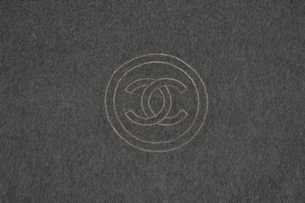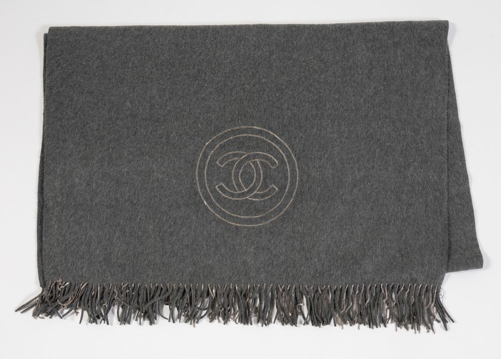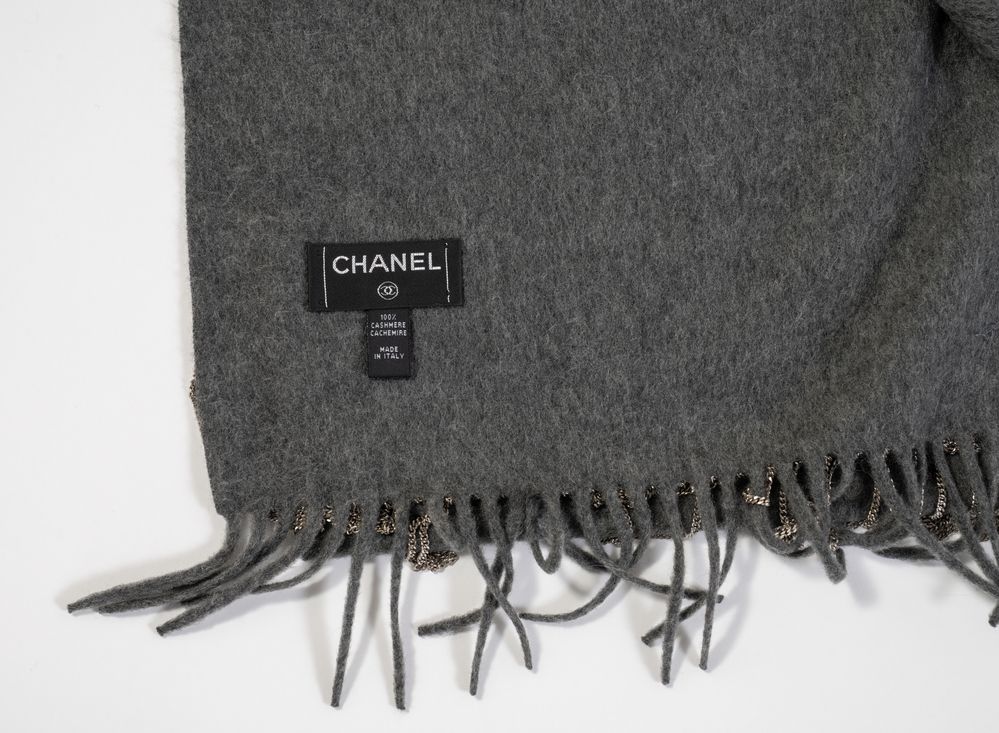 CHANEL Sciarpa in cashmere sui toni del grigio con applicazioni in metallo argentato. Cm 70x200. Composizione: 100% cashmere. Reca logo CC ed etichetta Chanel, Made in Italy.