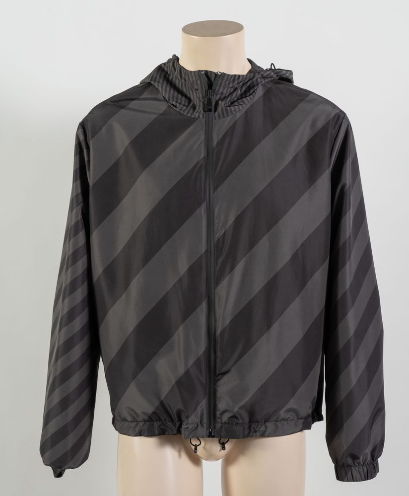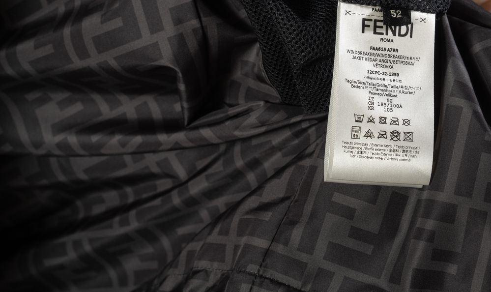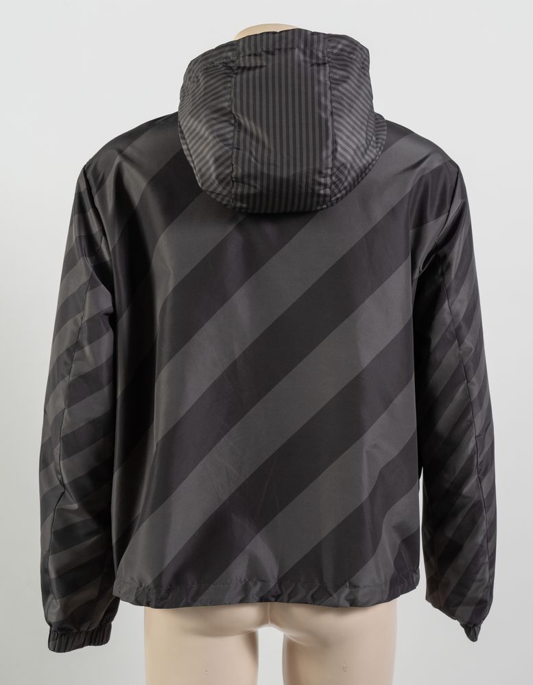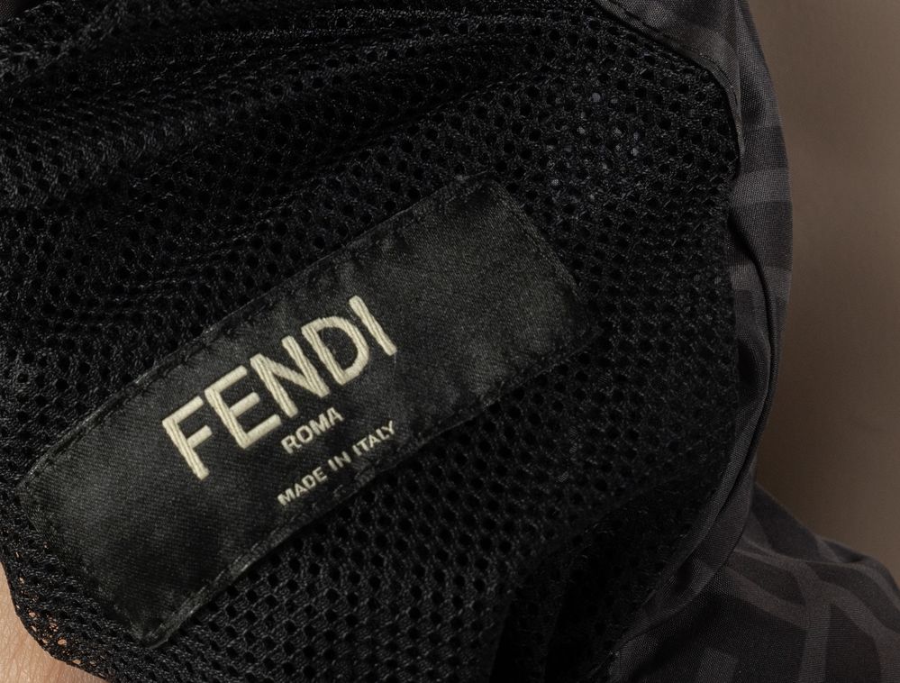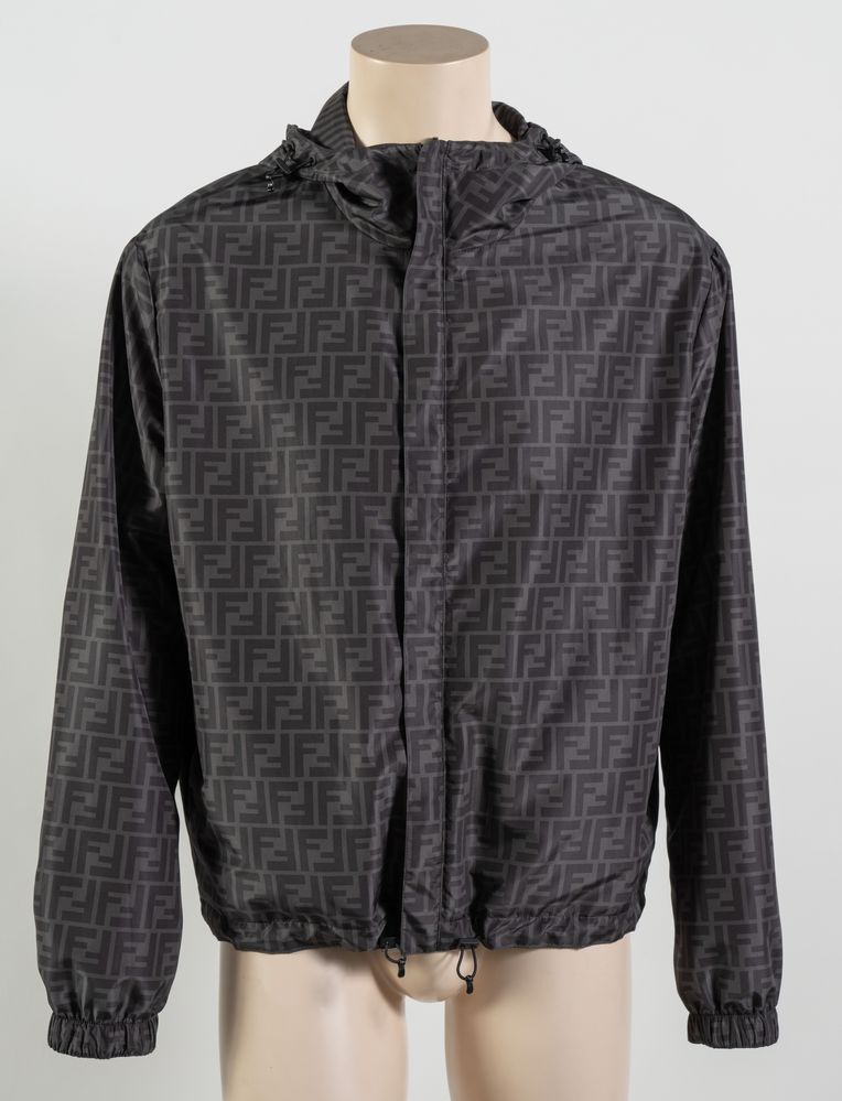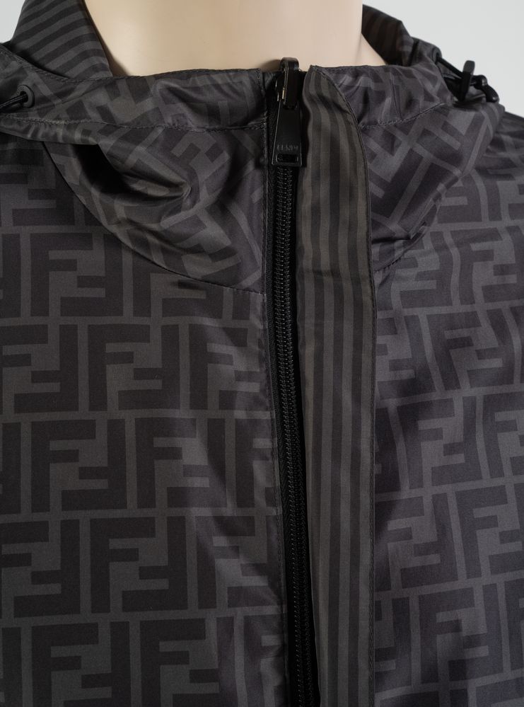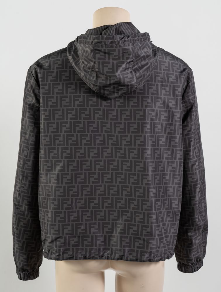 FENDI Giacca a vento in nylon reversibile a fantasia monogram Zucca sui toni del nero e del grigio. L'interno è a fantasia Pequin a righe sui toni del nero e del grigio. Collezione Primavera-Estate 2023. Taglia 52. Composizione 100% poliestere; composizione fodera 100% poliestere. Reca etichetta Fendi, Roma, Made in Italy e marchi FF e Fendi.