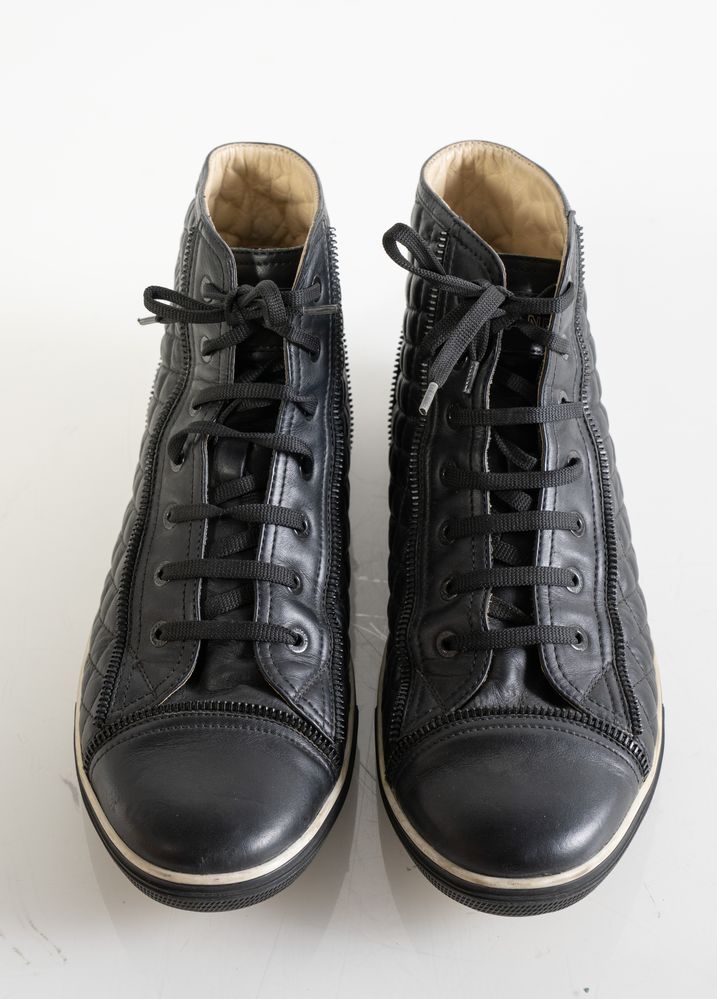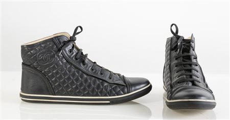CHANEL Scarpe sneakers in pelle nera con impunture matellassé e ricamo con logo CC. Taglia 42. Reca marchi Chanel e CC. Corredate da dustbag. (lievi difetti)