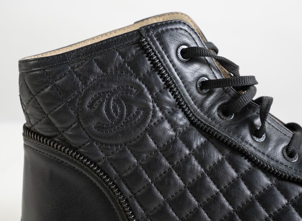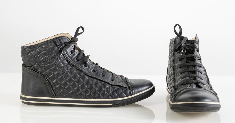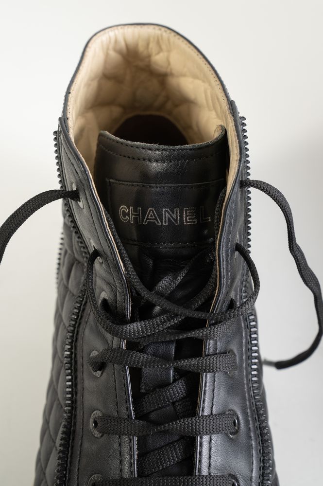 CHANEL Scarpe sneakers in pelle nera con impunture matellassé e ricamo con...
