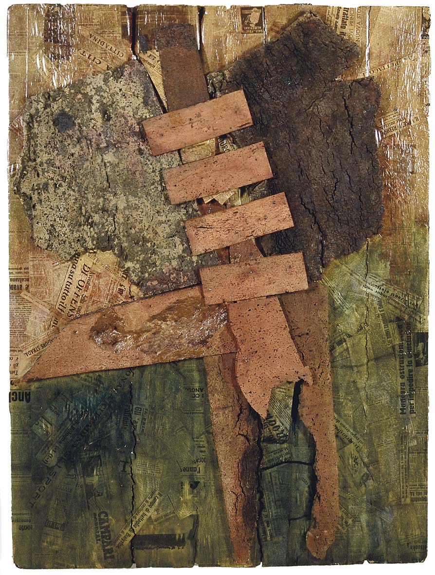 CRIPPA ROBERTO Milano 1921 - Bresso (Mi) 1972 senza titolo 1950 tecnica mista collage e sughero su tavola 120x90 firma al retro Autentica del figlio Roberto Crippa su foto e certificato di autenticità a cura dello Studio d'Arte Cadrama San Floriano Esposizioni: Galleria del Naviglio Milano; Galerie Kasper Losanna - timbri al retro