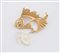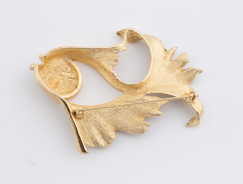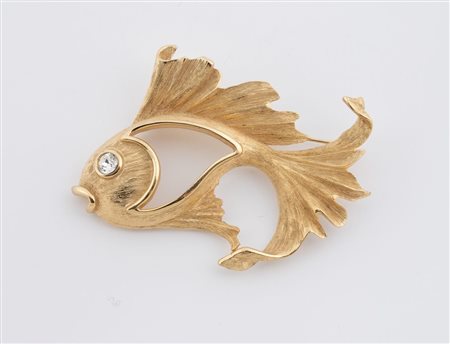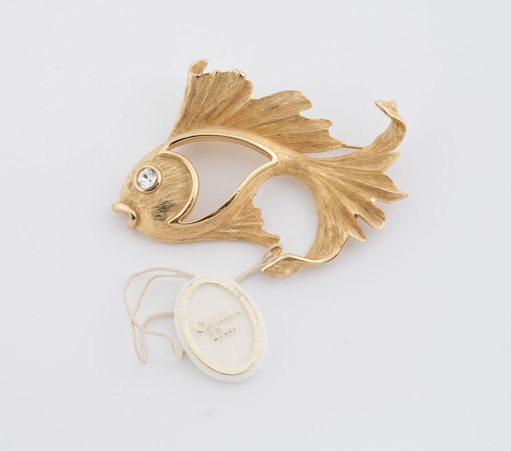 CHRISTIAN DIOR Spilla in metallo dorato a forma di pesce con applicazione di una pietra. Anni '80. Cm 5,6x7. Reca marchio Chr.Dior e cartellino Christian Dior.