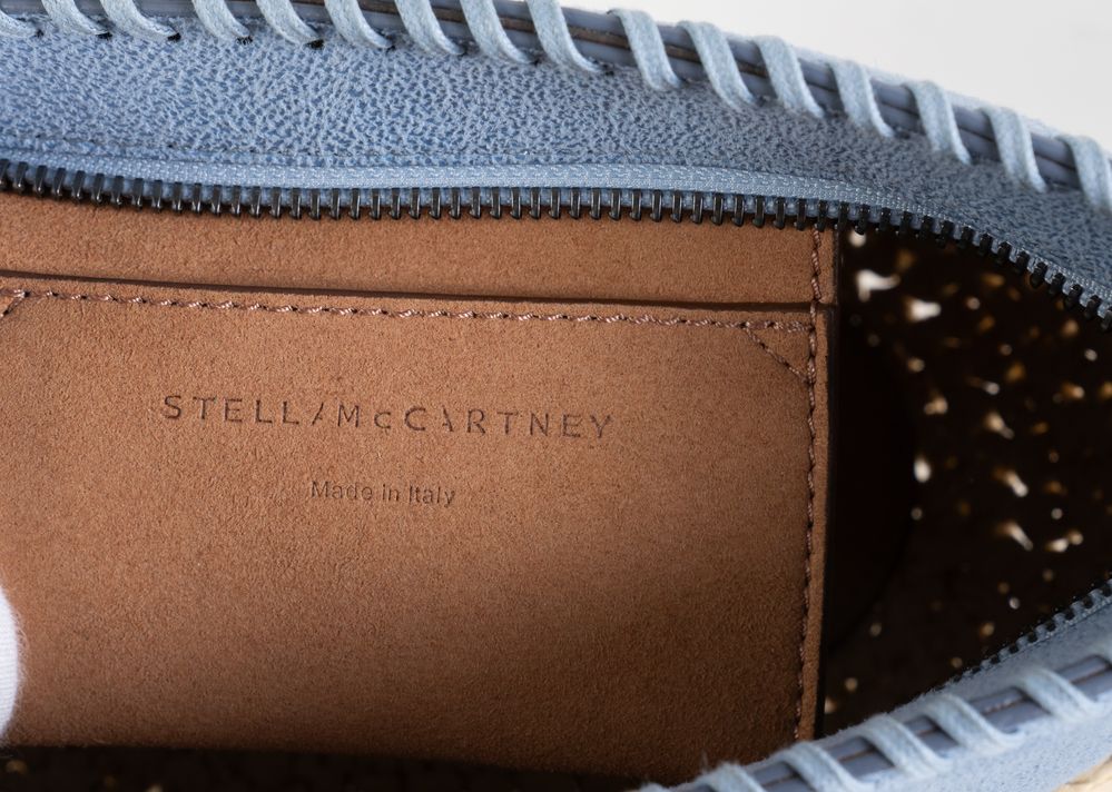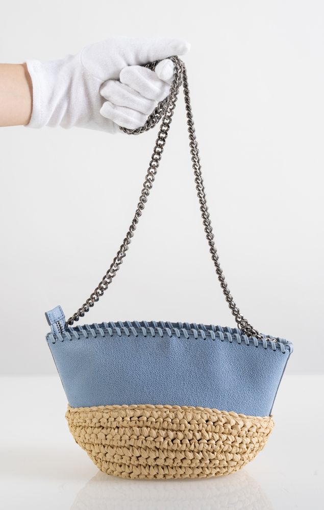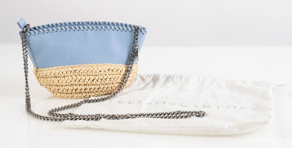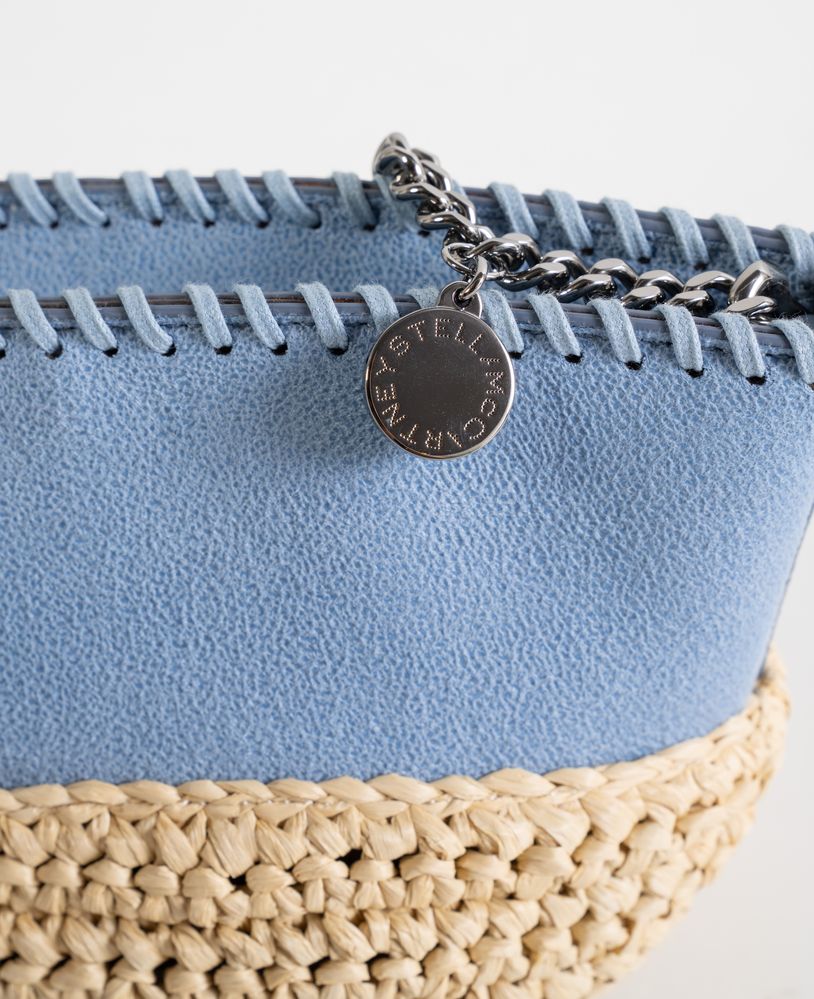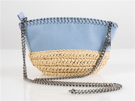 STELLA MCCARTNEY Borsa a tracolla modello Falabella in similpelle azzurra e rafia. Tracolla in metallo argentato. Cm 14x23x9; tracolla cm 112. All'interno reca in una tasca. Reca marchio, etichetta e cartellino Stella McCartney, Made in Italy e codice di riferimento prodotto. Corredata da dustbag. (nuova)
