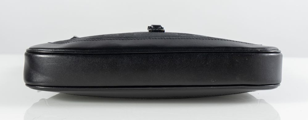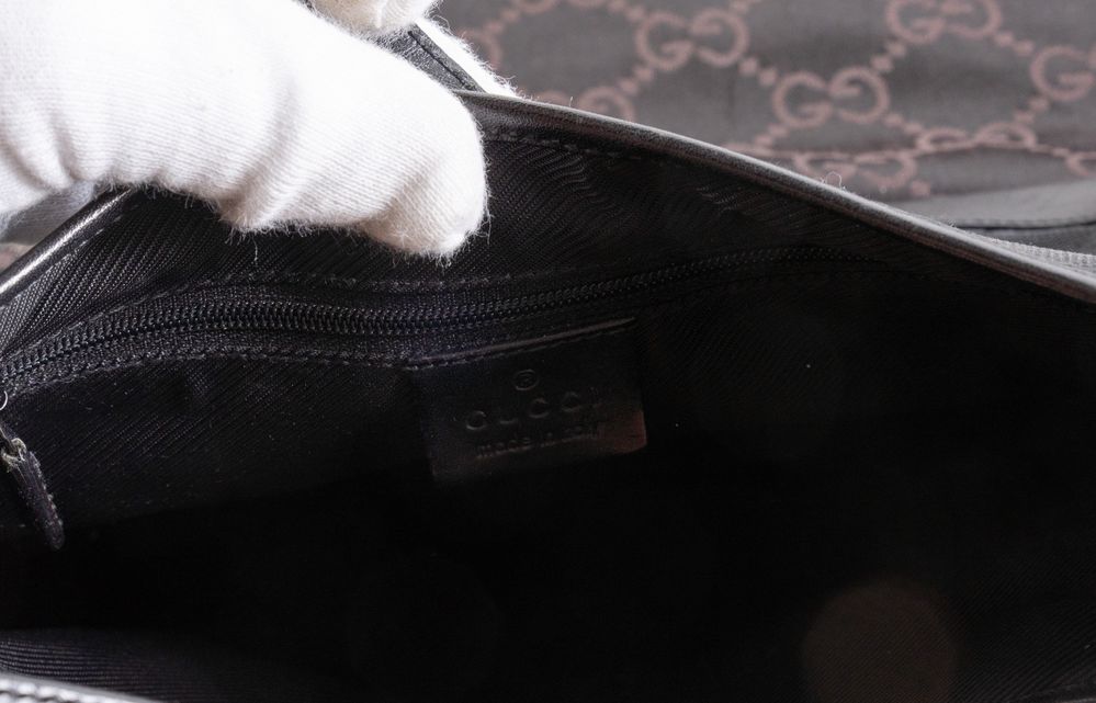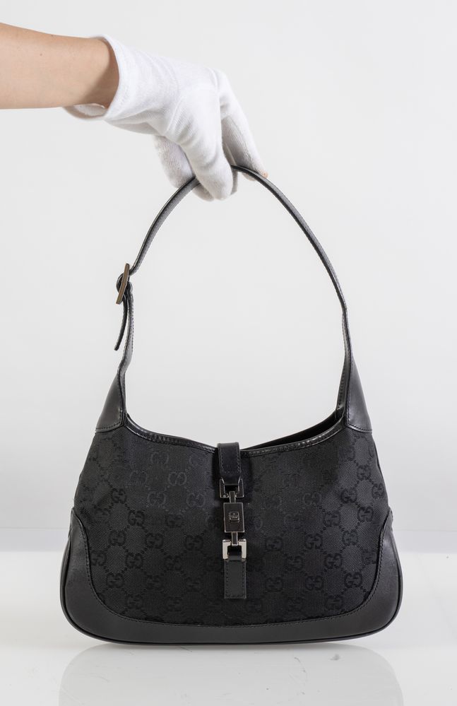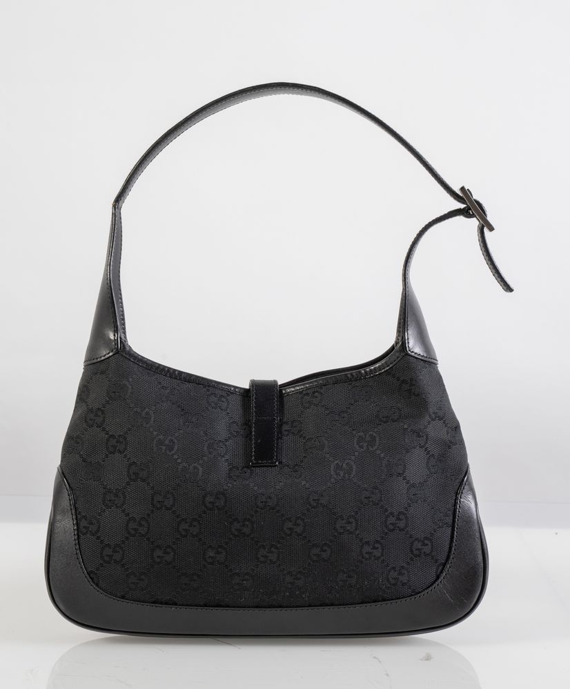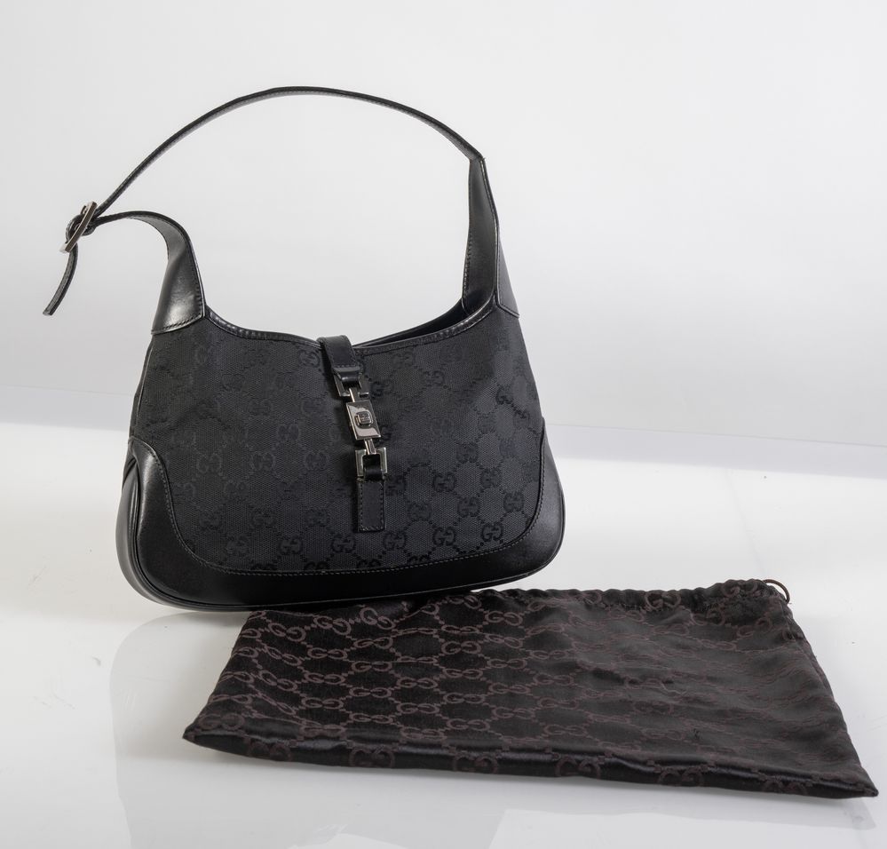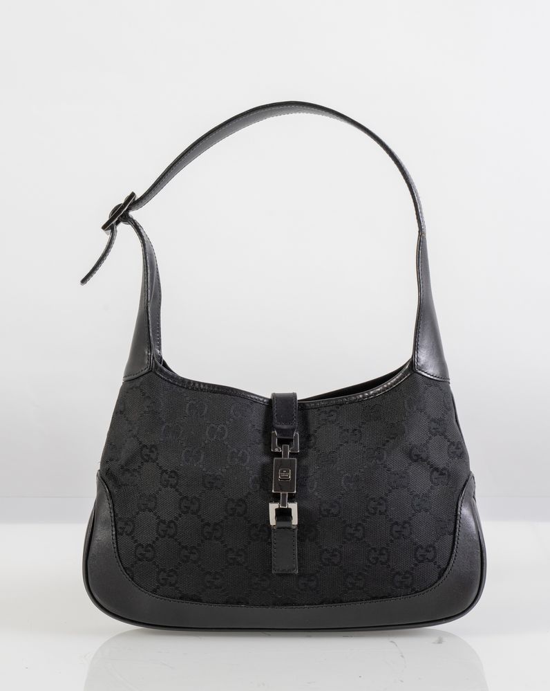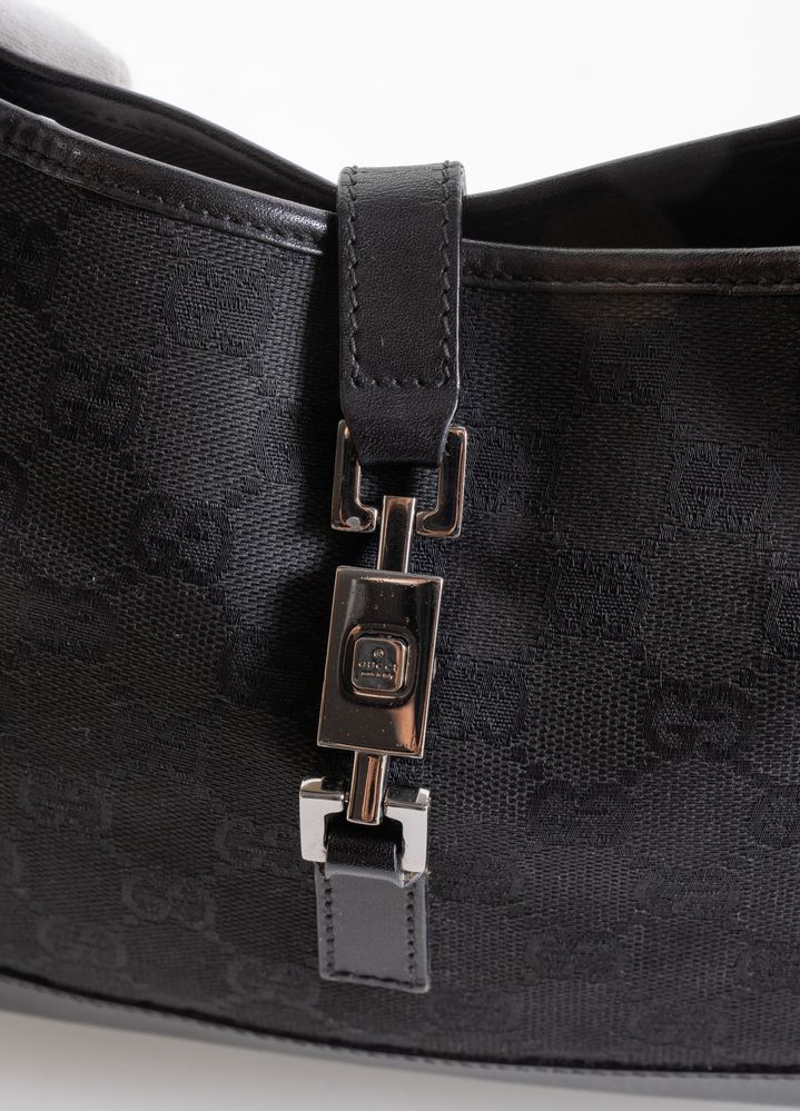 GUCCI Borsa modello Jackie in tela monogram nera e dettagli in pelle nera e finiture in metallo argentato. Cm 16x27x4; altezza con manico cm 37. Reca marchi GG, Gucci, Made in Italy e codice di riferimento prodotto. Corredata da dustbag. (lievi difetti)