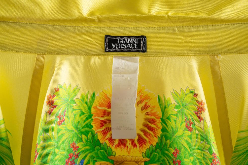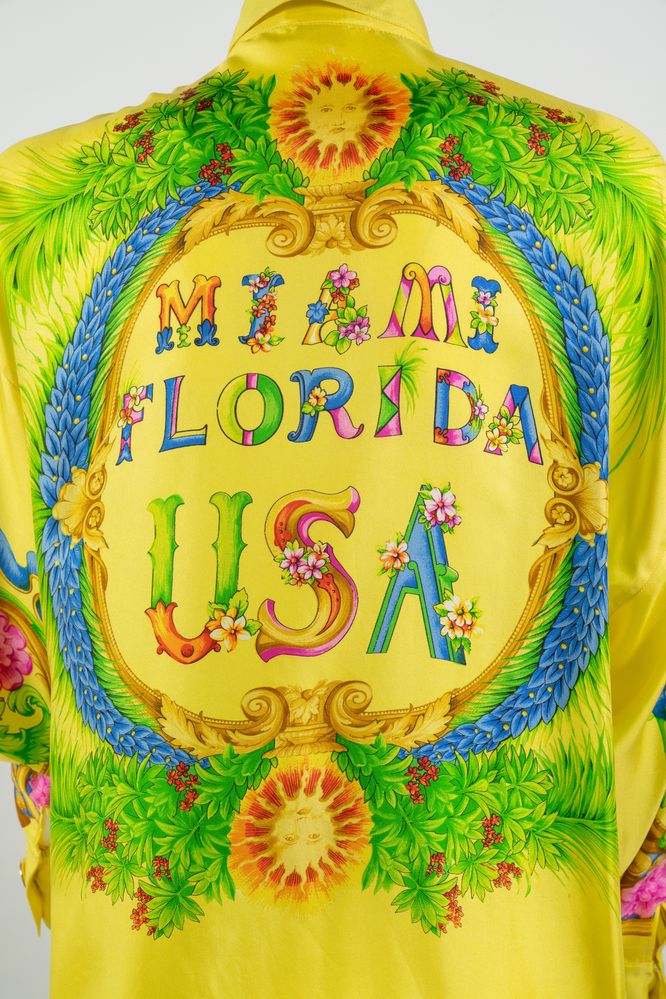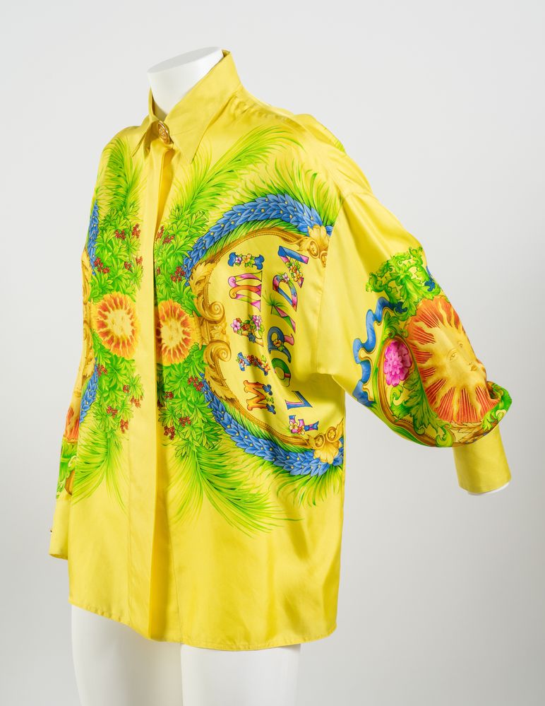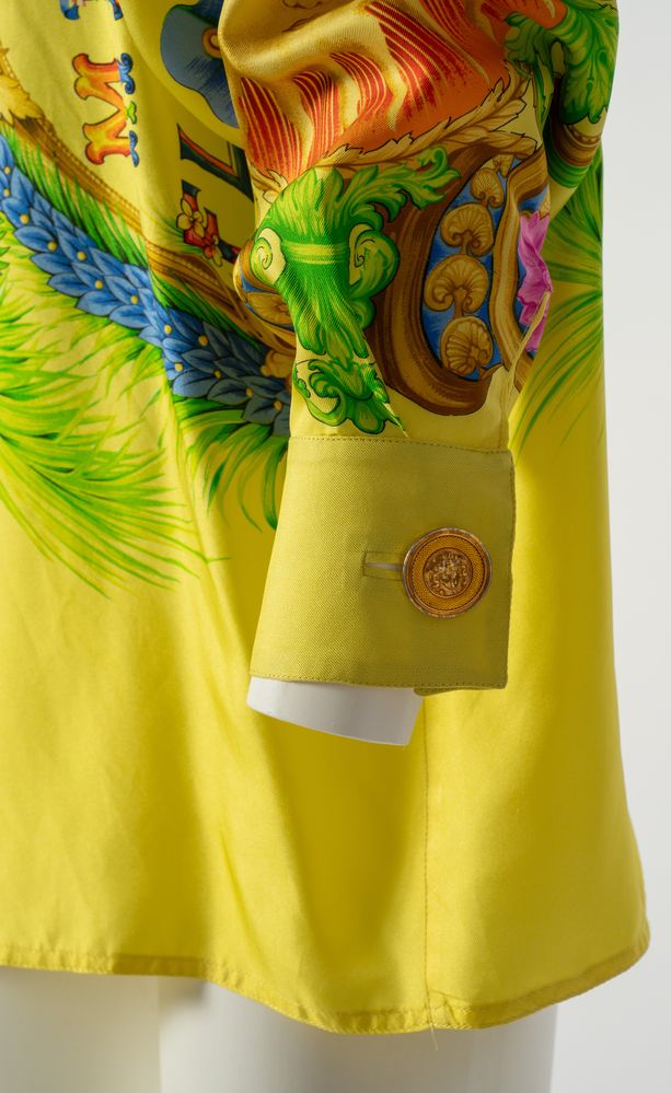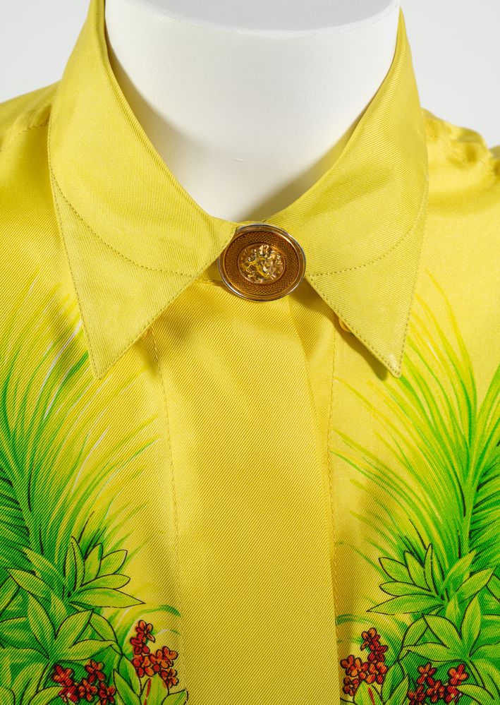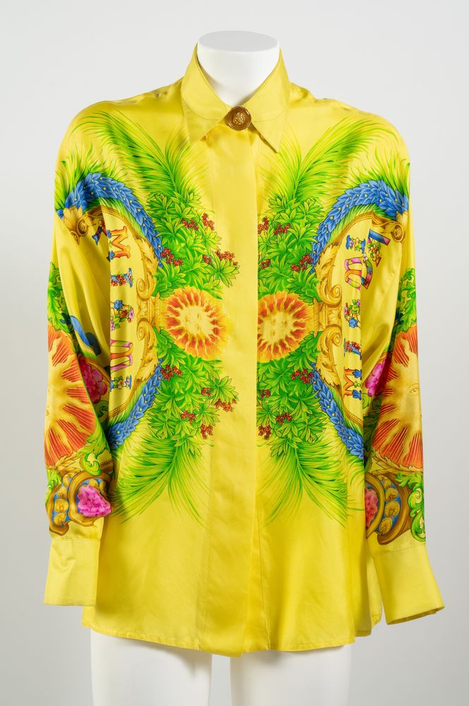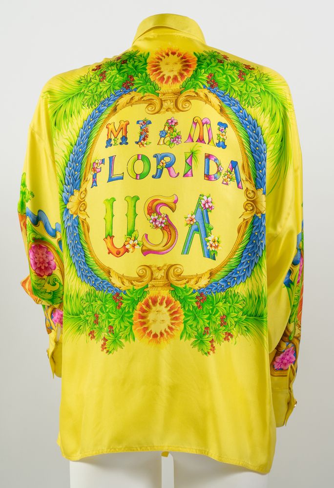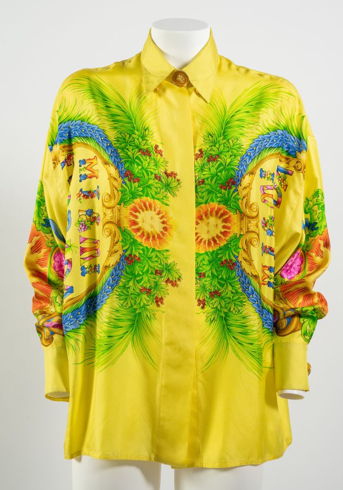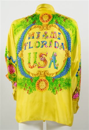 GIANNI VERSACE Couture Camicia "Miami Florida" in seta a fantasia multicolore sui toni del giallo, verde, blu e rosso con bottoni gioiello in metallo dorato e smalto con logo Medusa. Collezione Miami Primavera/Estate 1993. Taglia non riportata. Composizione 100% seta. Reca etichetta Gianni Versace Couture, Made in Italy. Un esemplare identico è stato esposto alla Mostra "Gianni Versace Retrospective" presso il Groening Museum, Groening. Bibliografia: Gianni e Donatella Versace, South Beach Stories, 1993. (lievissimi difetti)