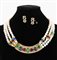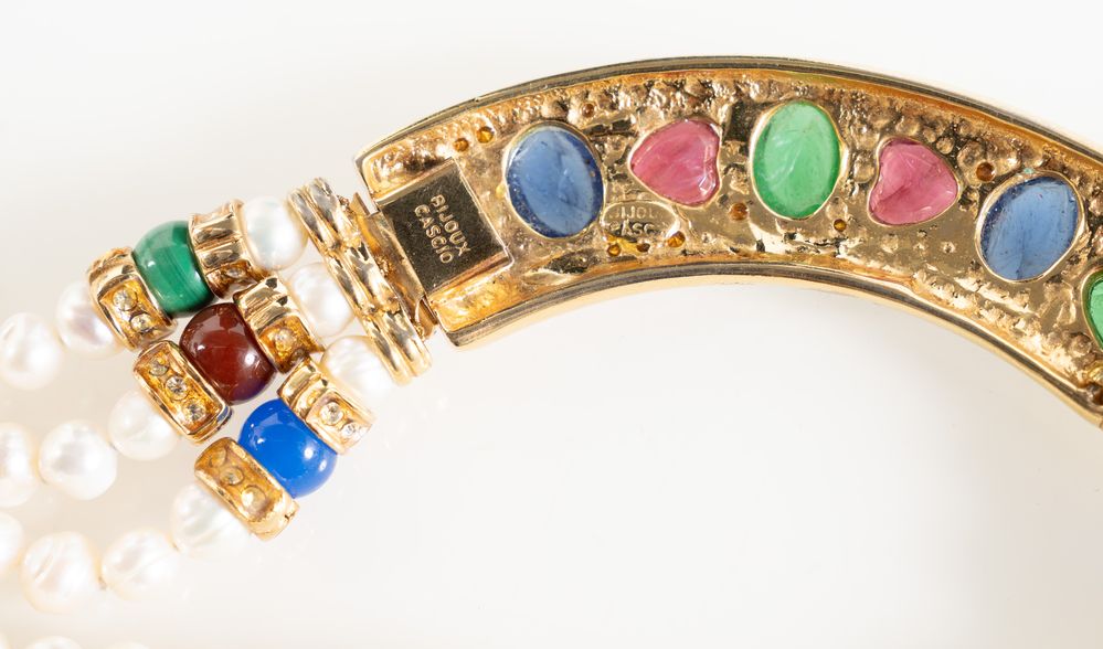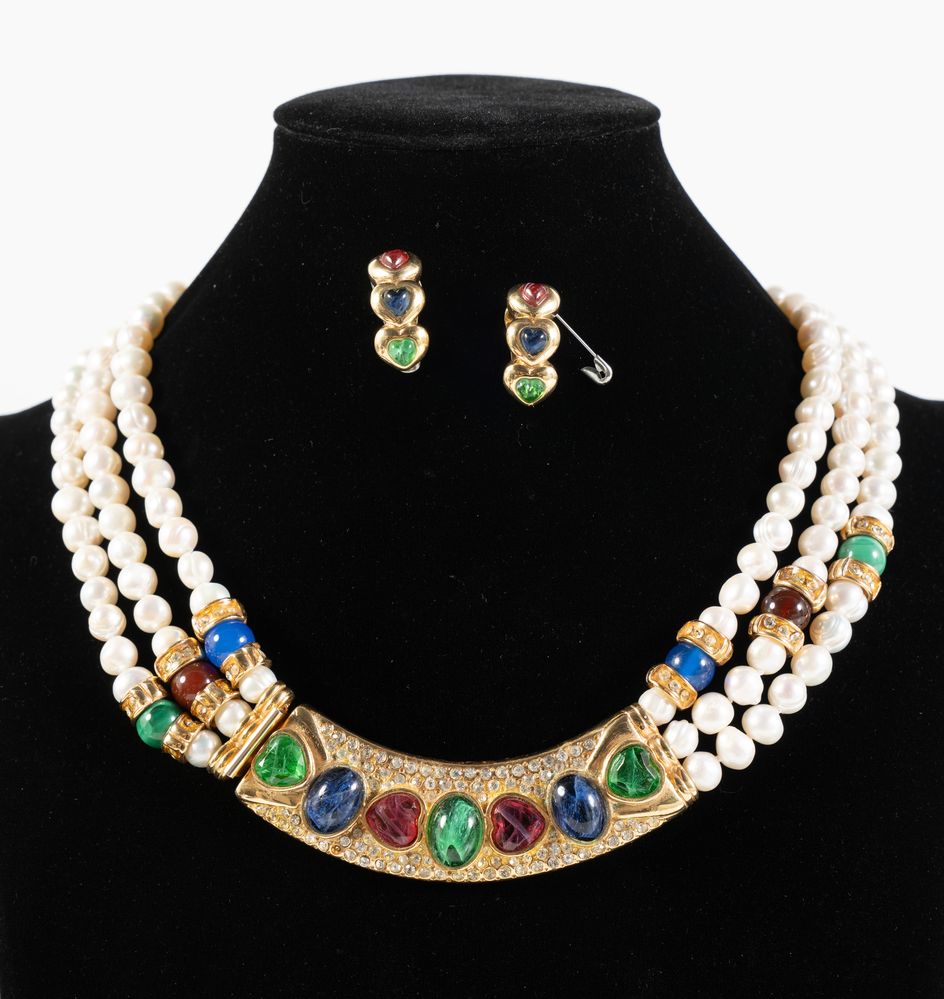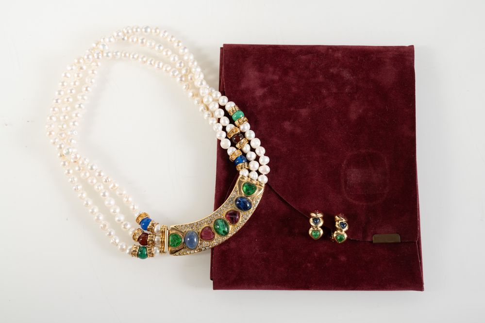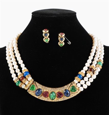 CASCIO BIJOUX Demi parure composta da collana e orecchini. La collana è realizzata in tre fili di perle e metallo dorato con applicazioni di pietre sui toni del verde, rosso e verde e strass. Gli orecchini sono realizzati a forma di tre cuori in metallo dorato con applicazioni di pietre sui toni del rosso, blu e verde. Collana cm 2,2x53; orecchini cm 2,3x1. Al retro la collana reca marchi Bijoux Cascio. Corredata da dustbag. (lievissimi difetti)