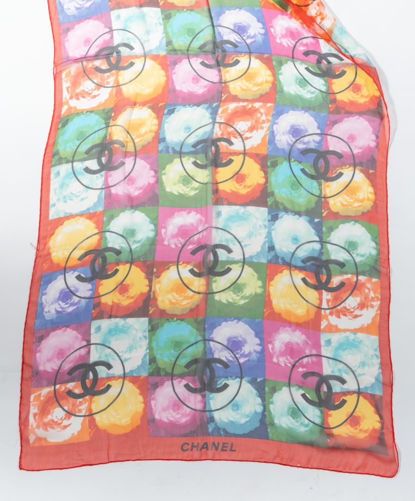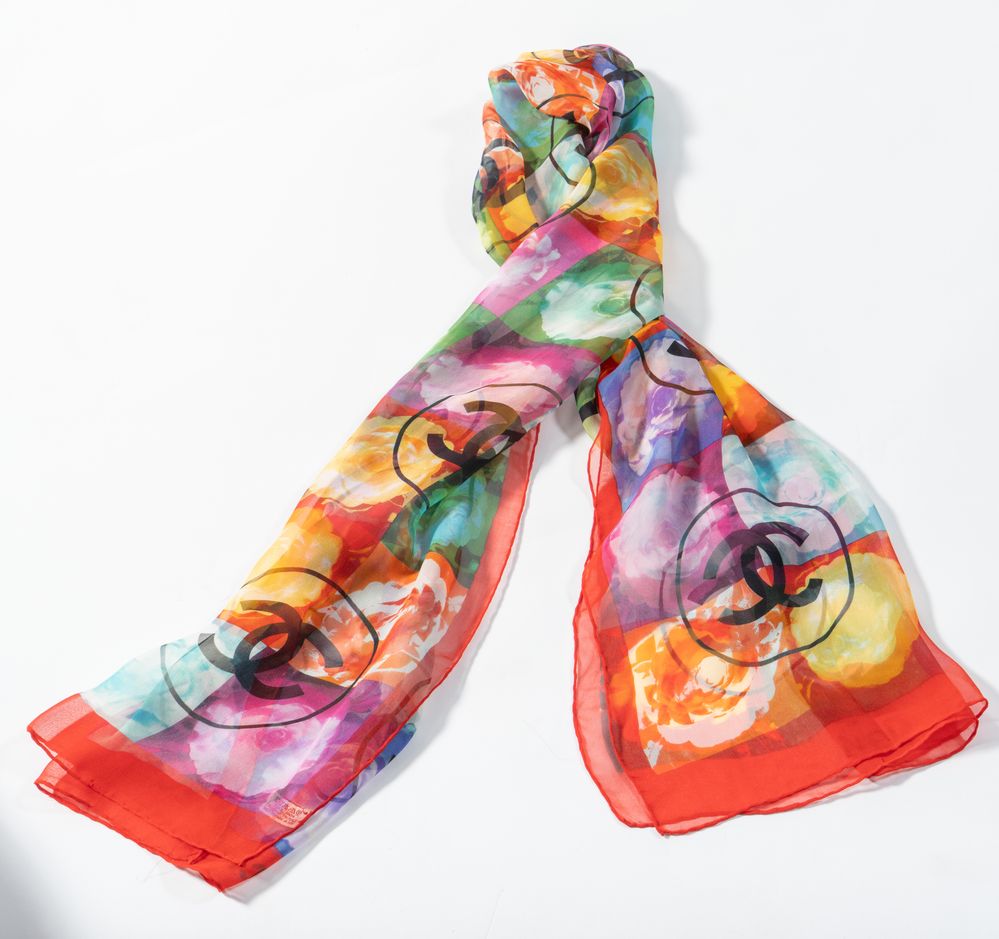 CHANEL Foulard in seta multicolore a fantasia floreale e CC. Cm 65x150. Composizione: 100% seta. Reca marchi CC e Chanel ed etichetta Made in Italy. (lievi difetti)
