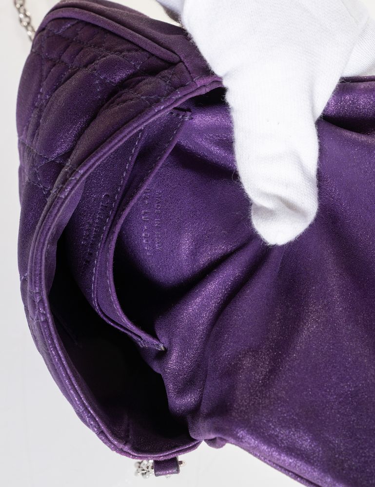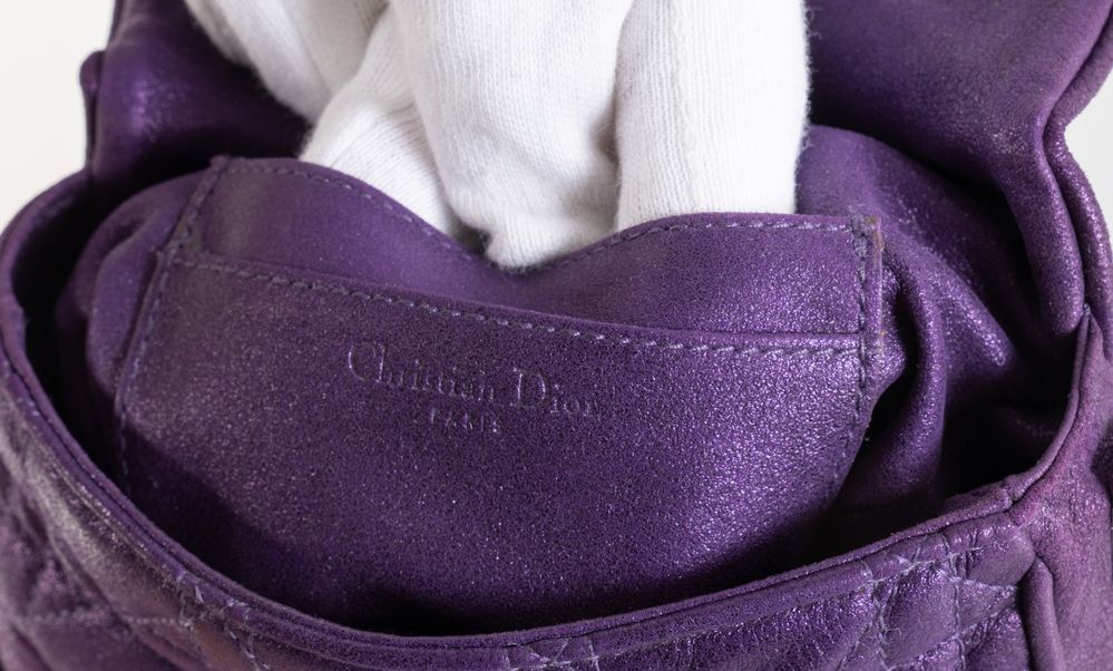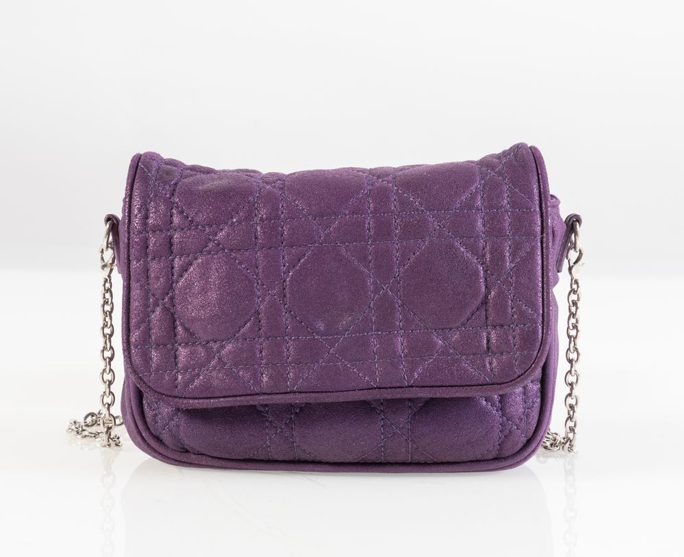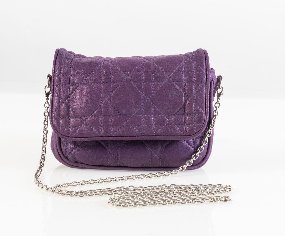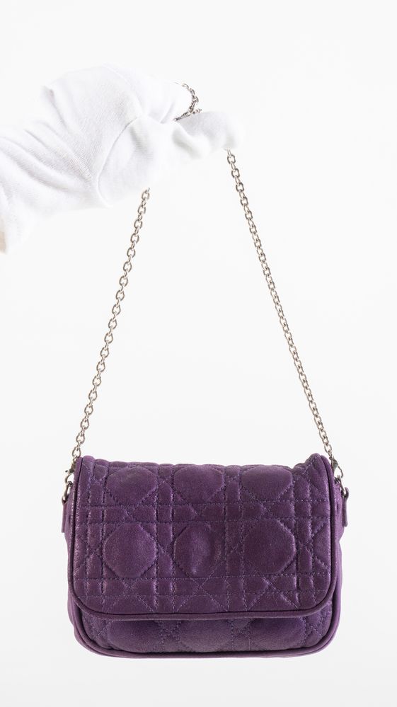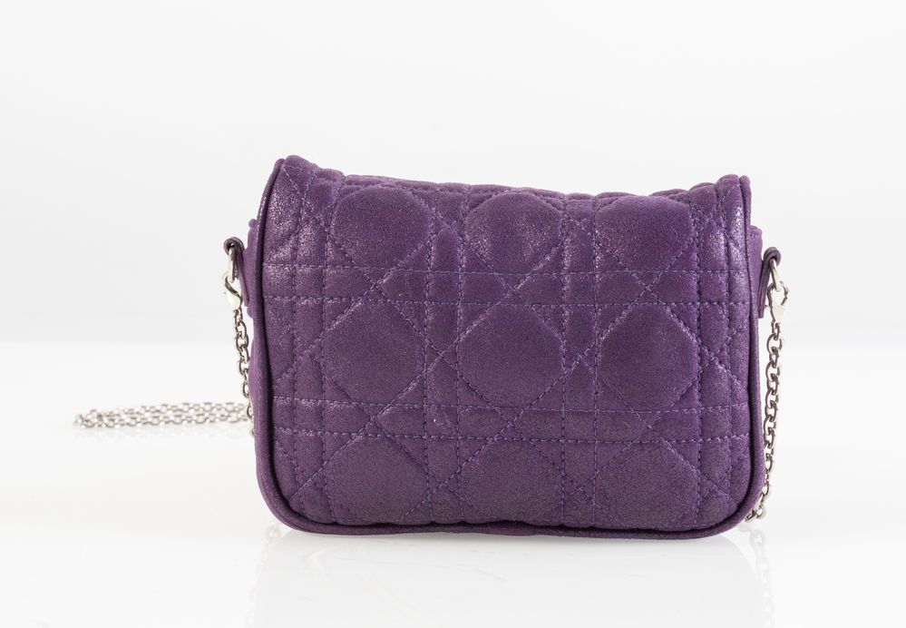 CHRISTIAN DIOR Mini borsa a tracolla della serie Lady Dior in pelle viola con impuntura Cannage. Cm 11,5x15x4; tracolla cm 120. Tracolla removibile in metallo argentato. All'interno reca tre fessure per carte. Reca marchio Christian Dior Paris, Made in Italy e codice di riferimento prodotto. Corredata da dustbag.