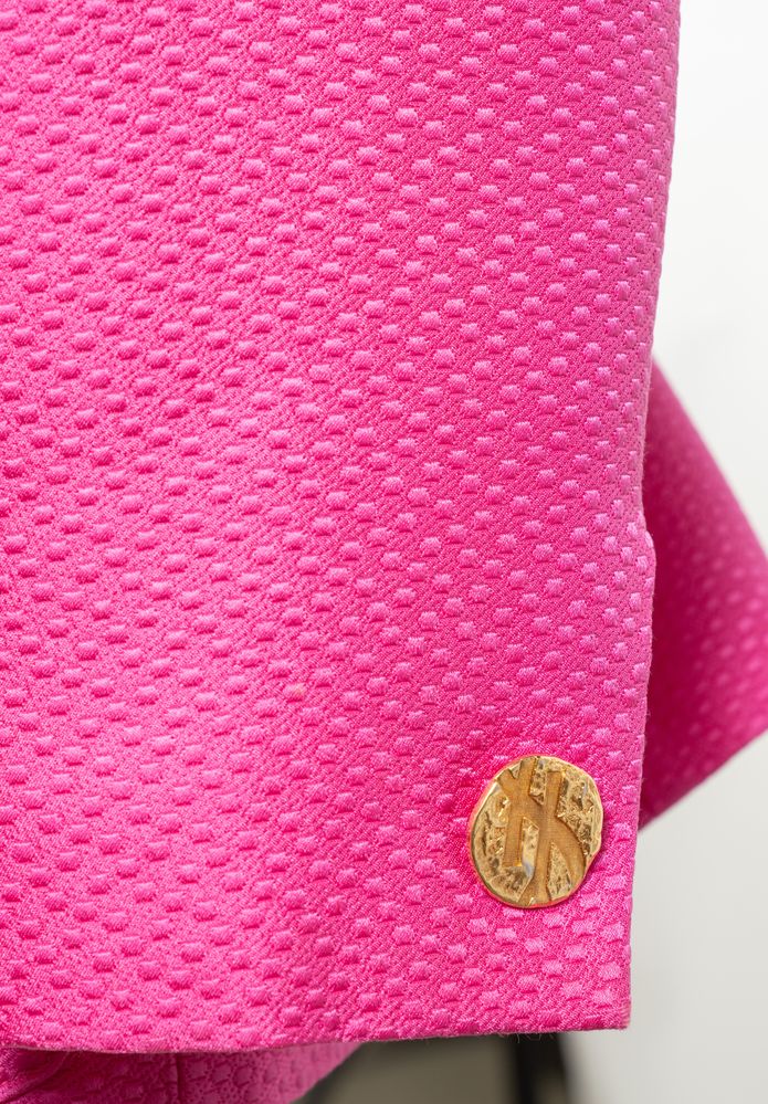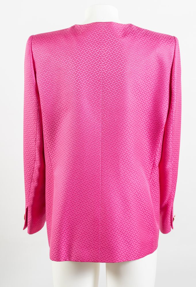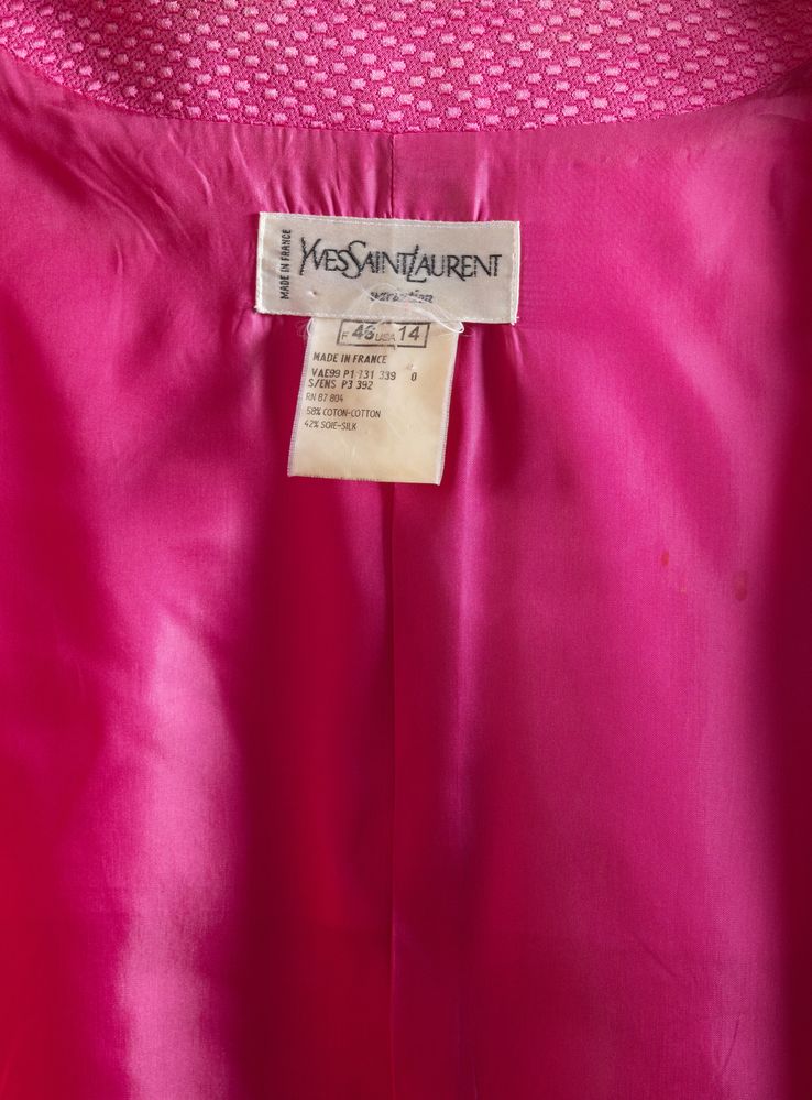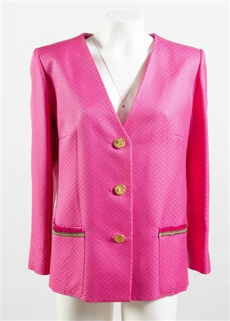 YVES SAINT LAURENT Variatíon Giacca sui toni del rosa con bottoni in metallo dorato e dettagli in passamaneria. Riporta taglia F 46 USA 14. Composizione: 58% cotone e 42% seta. Reca etichetta Yves Saint Laurent Variatíon Made in France.