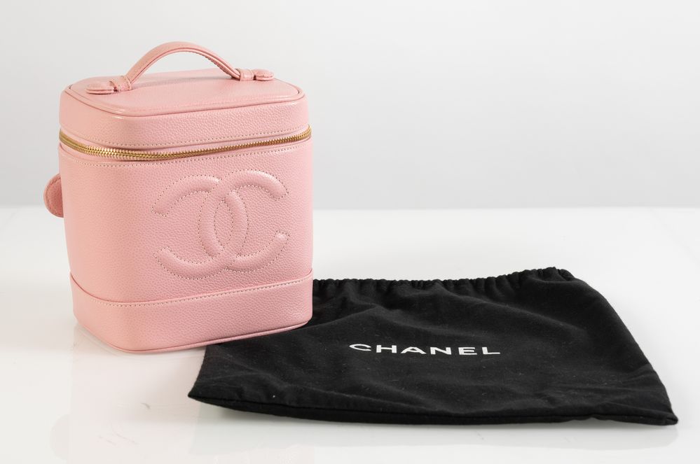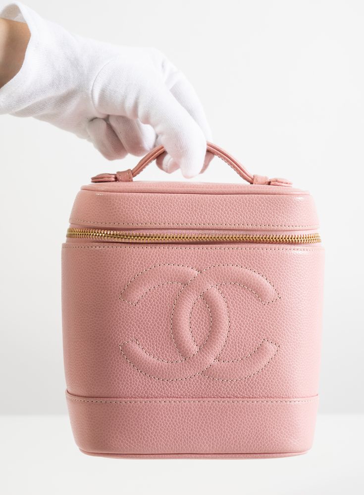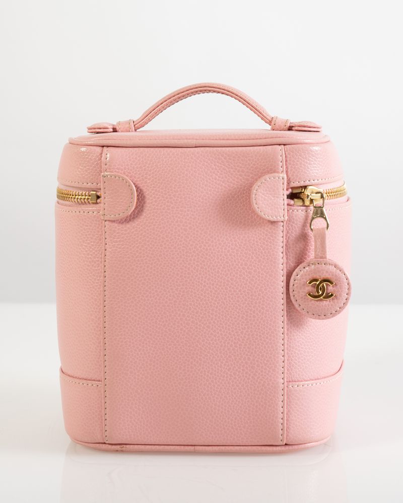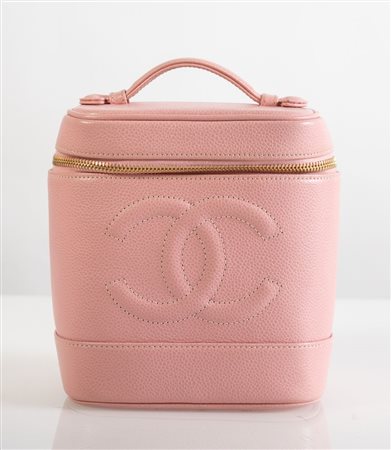 CHANEL Borsa modello Vanity in pelle caviar martellata rosa con ricamo con logo CC. Anni 2002-2005. Cm 17,5x15x13; manico cm 15. Dettagli in metallo dorato e interno foderato in pelle bianca. All'interno reca scomparto. Reca marchi CC, Chanel, Made in Italy. Reca codice di riferimento prodotto e carta di autenticità. Corredata da dustbag. (lievissimi difetti)
