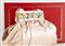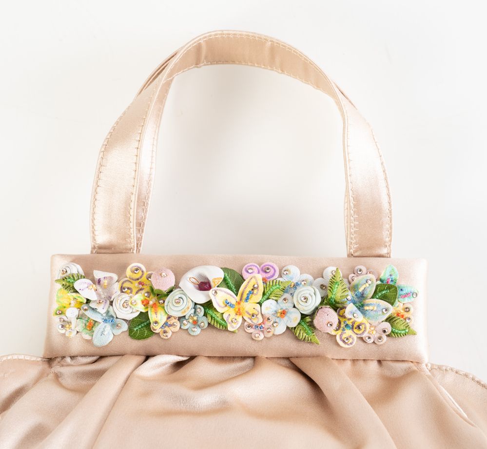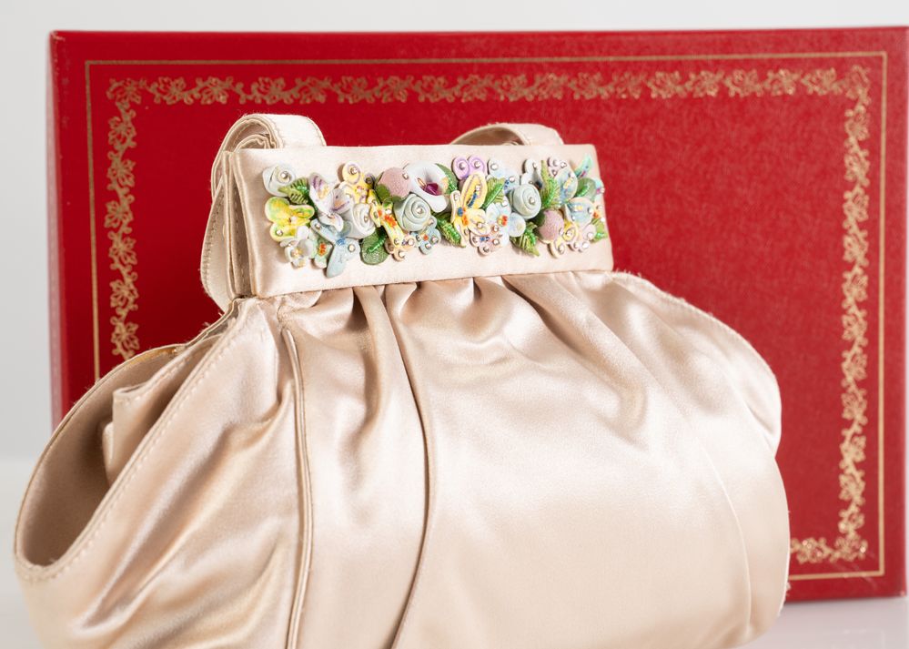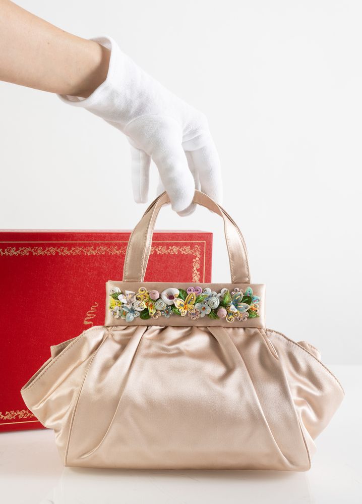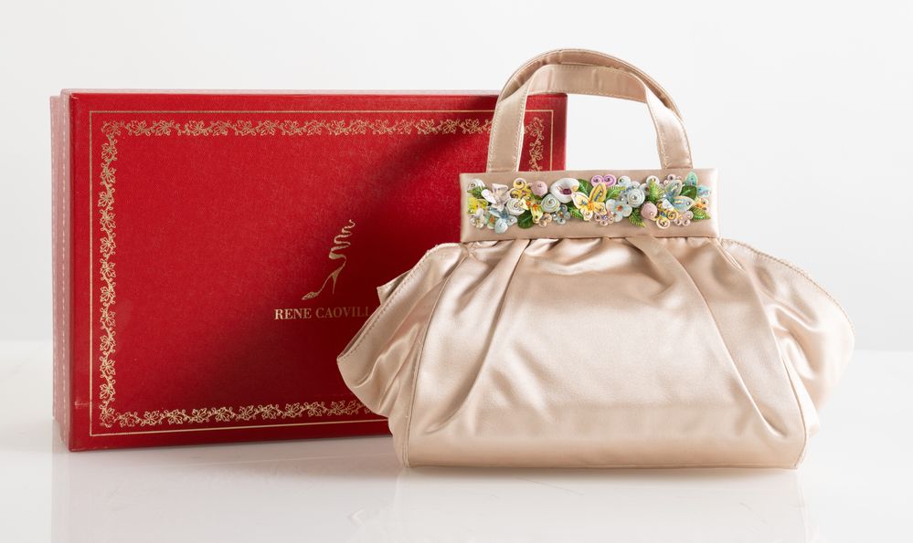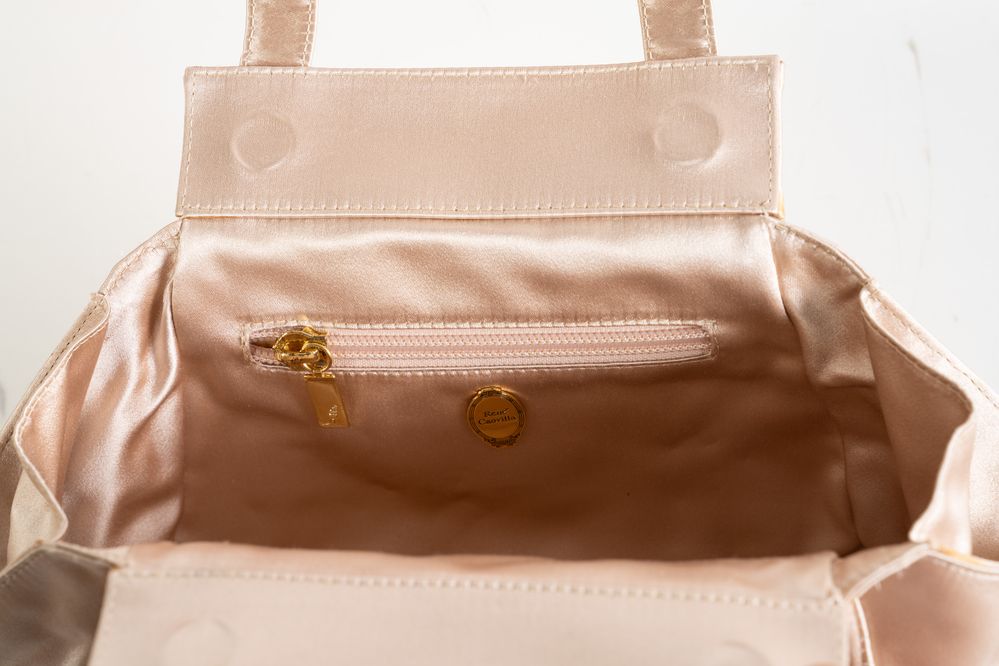 RENÉ CAOVILLA Borsa a mano in raso di seta color cipria con applicazioni floreali in pelle e strass. Cm 17x28x7; altezza con manici cm 26. All'interno reca una tasca. Reca marchio Renè Caovilla, Made in Italy. Corredata da scatola e dustbag. (lievissimi difetti)