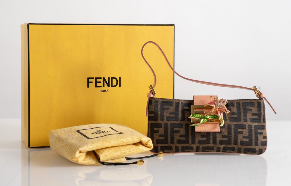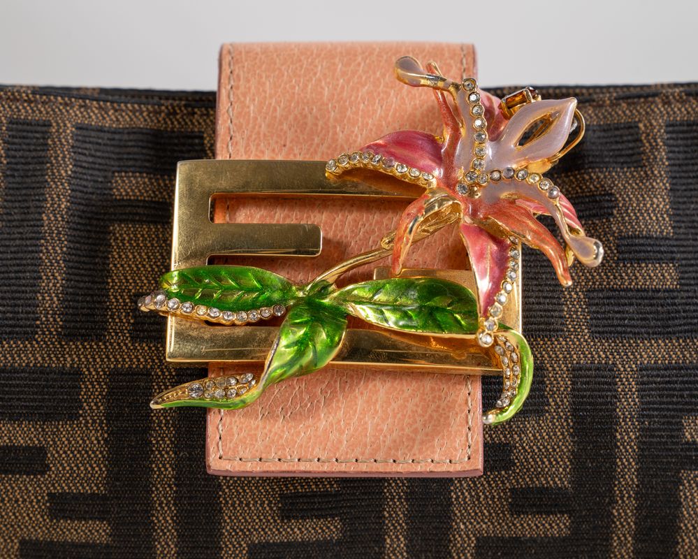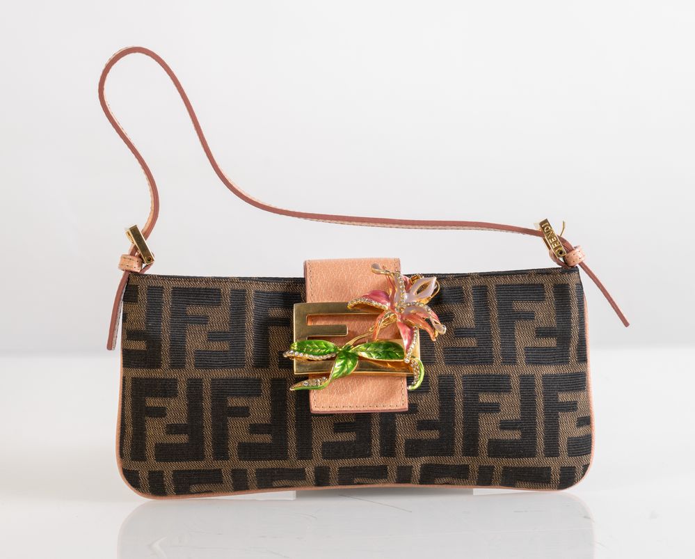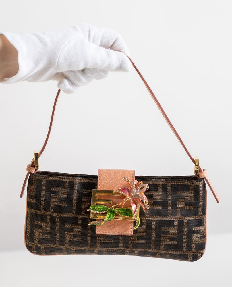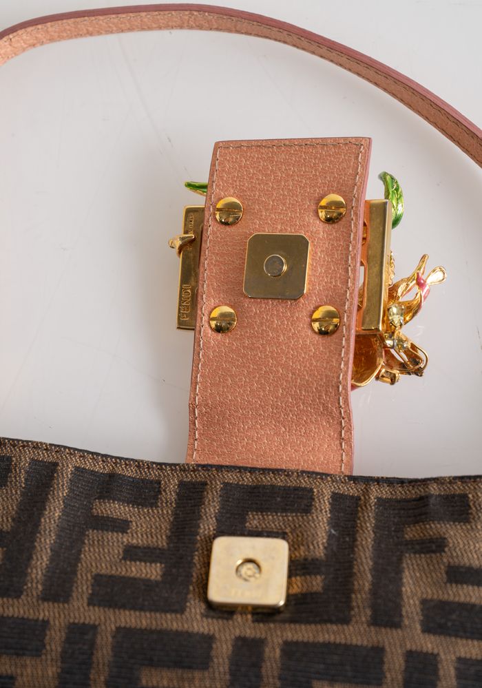 FENDI Borsa in tela Zucca monogram con dettagli in pelle rosa pesca, dettagli in metallo dorato e chiusura con bijoux in smalti e strass multicolore. Edizione limitata 2014. Cm 11x23; manico lunghezza totale cm 46,5. Reca marchi FF, Fendi, Made in Italy e codice di riferimento prodotto. Corredata da scatola e dustbag.