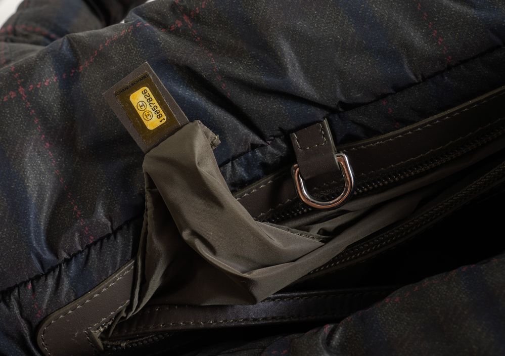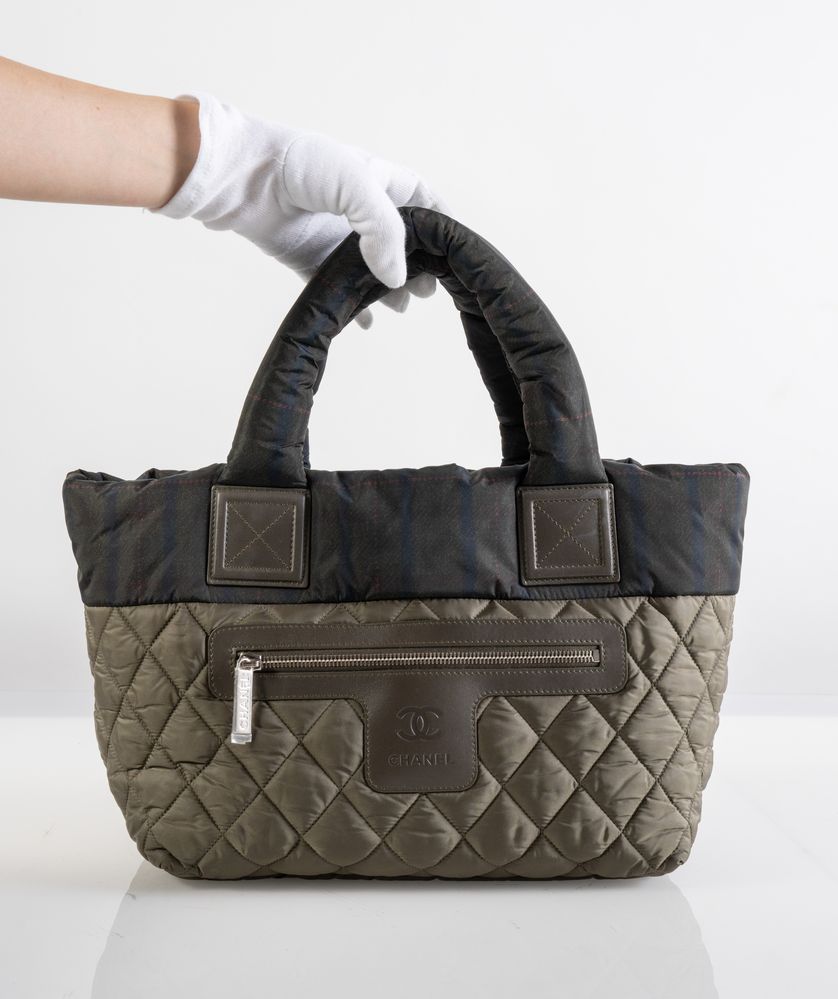 CHANEL Borsa modello Cocoon in nylon color khaki con motivo matellassé e finiture in pelle color khaki e tessuto scozzese sui toni del verde e del blu. Collezione 2013. Cm 24x42x12; altezza con manici cm 37. Reca una tasca frontale e una interna. Dettagli in metallo argentato. Reca marchi ed etichetta CC, Chanel. Reca codice di riferimento prodotto e carta di autenticità. Corredata da scatola.