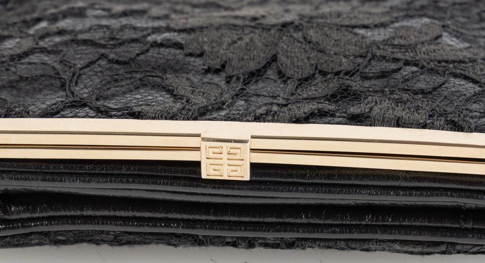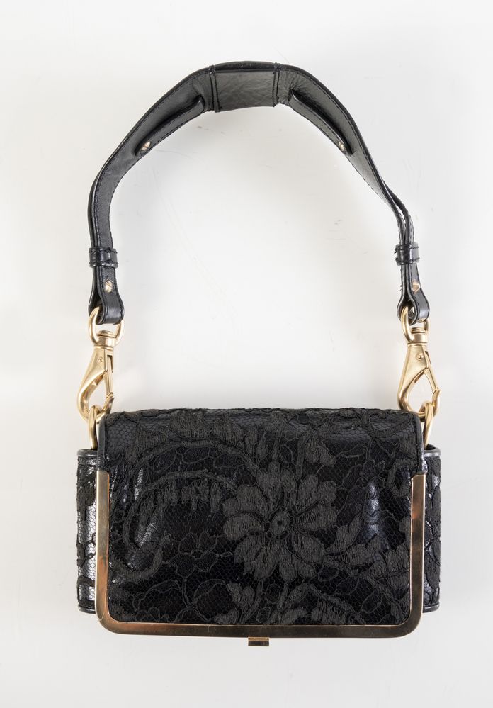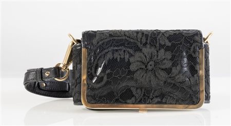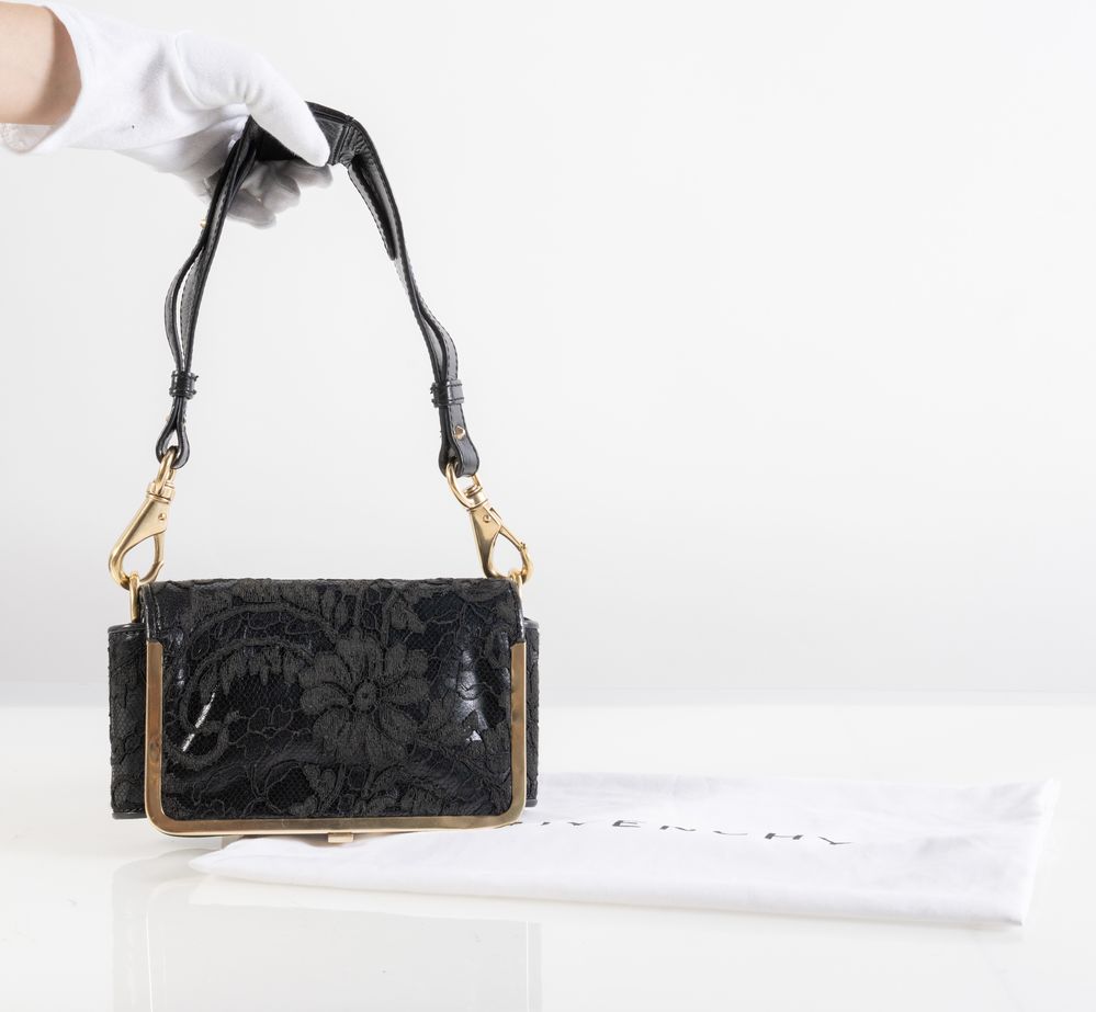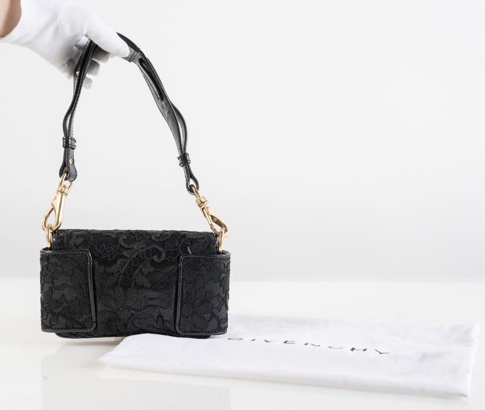 GIVENCHY Borsa in pelle nera con applicazioni in pizzo e tracolla removibile. Cm 14x23x4; tracolla cm 60. Dettagli in metallo argentato. Reca due scomparti e una tasca interna. Reca marchi Givenchy, Made in Italy e codice di riferimento prodotto. Corredata di dustbag.
