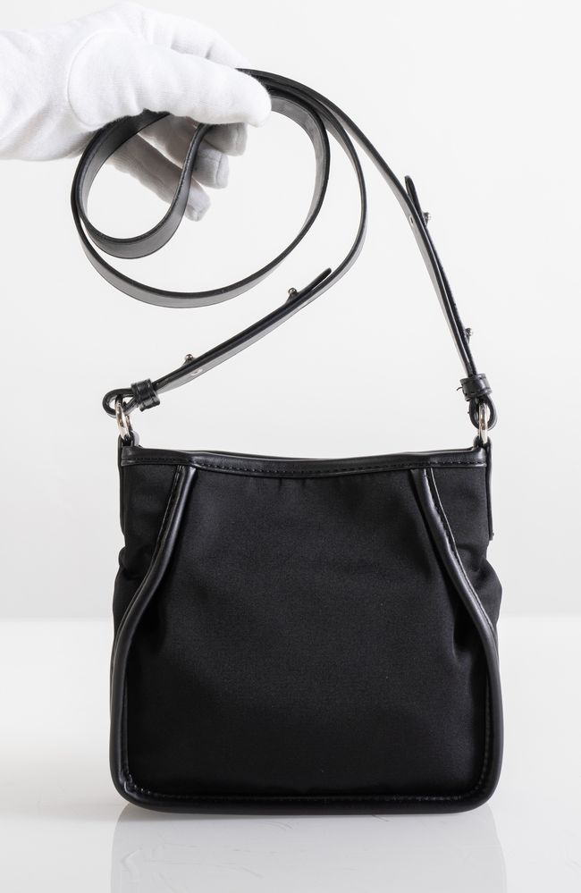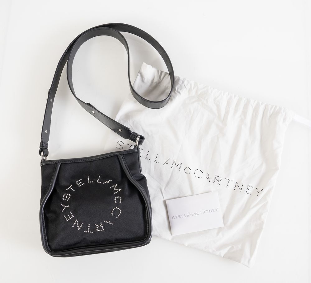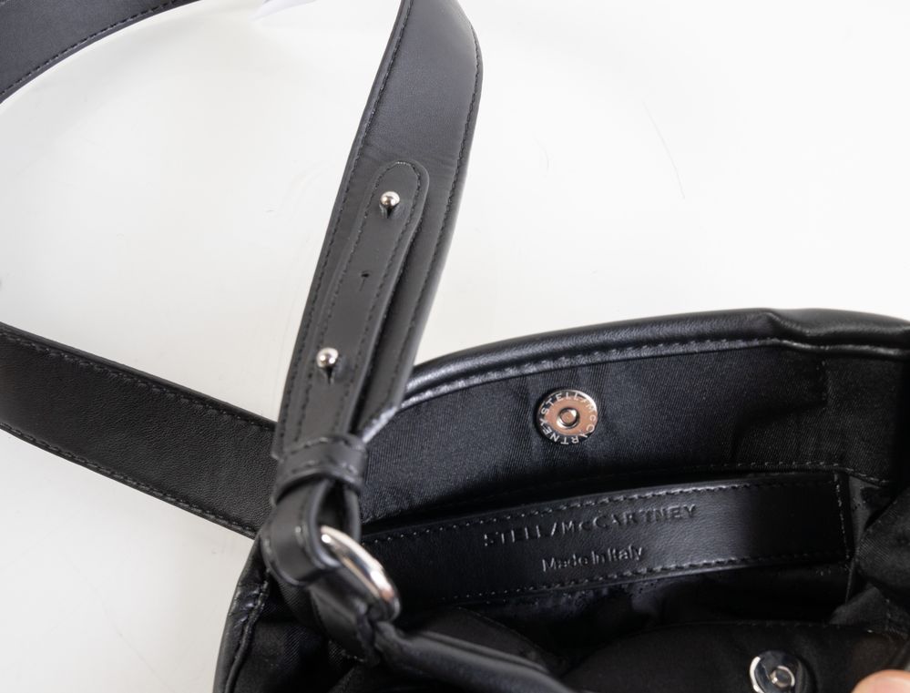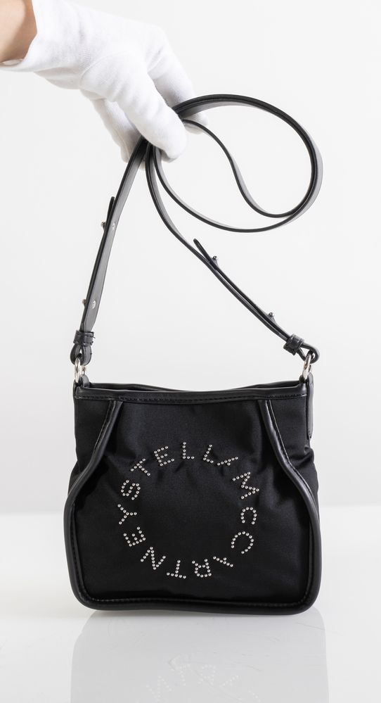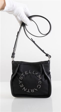 STELLA MCCARTNEY Borsa a tracolla in tela di nylon rigenerato nera con finiture in similpelle nera e metallo argentato. Cm 17x18x5; tracolla cm 3x112. All'interno reca una tasca. Reca marchio, etichetta e cartellino Stella McCartney, Made in Italy e codice di riferimento prodotto. Corredata da dustbag. (nuova)