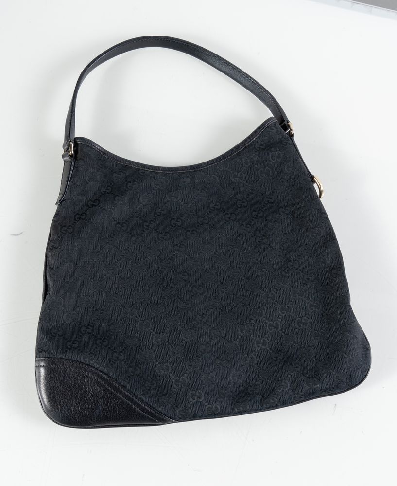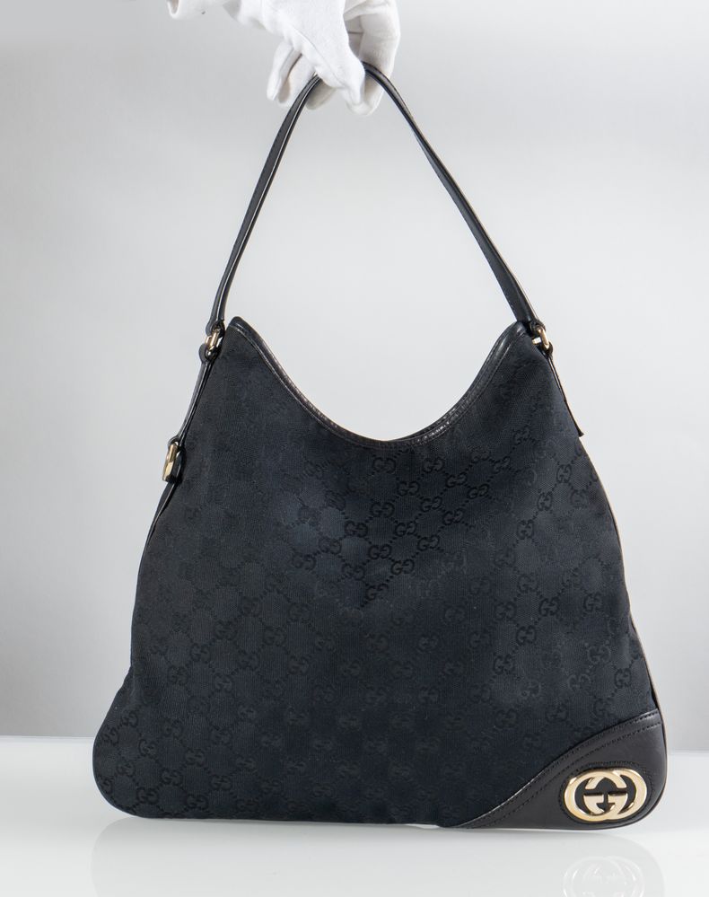 GUCCI Borsa modello New Britt in tela monogram nera con finiture in pelle nera e metallo dorato. Cm 30x35x2; altezza con manico cm 45. All'interno reca una tasca con zip e due tasche. Reca marchi GG, Gucci, Made in Italy e codice di riferimento prodotto. (lievissimi difetti)
