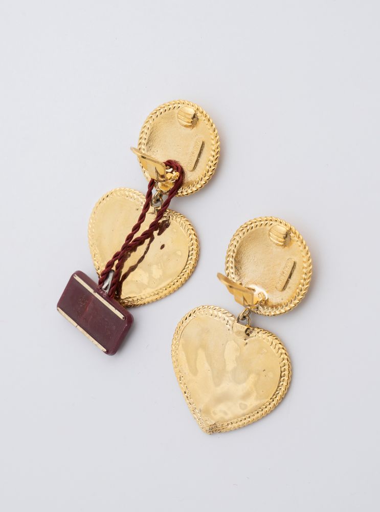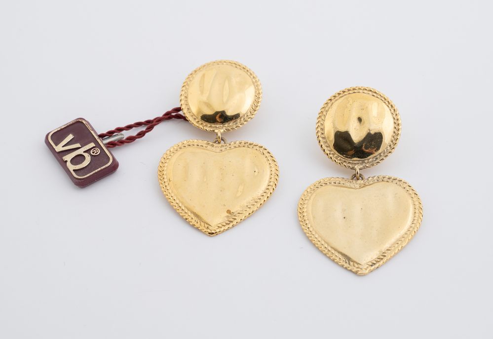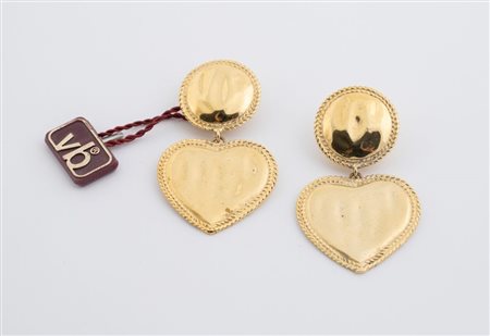 VOGUE BIJOUX Orecchini a clip in metallo dorato recanti una parte circolare e un pendente a forma di cuore. Cadauno cm 6x3,5. Recano marchi Vogue Bijoux e cartellino VB. (lievissimi difetti)