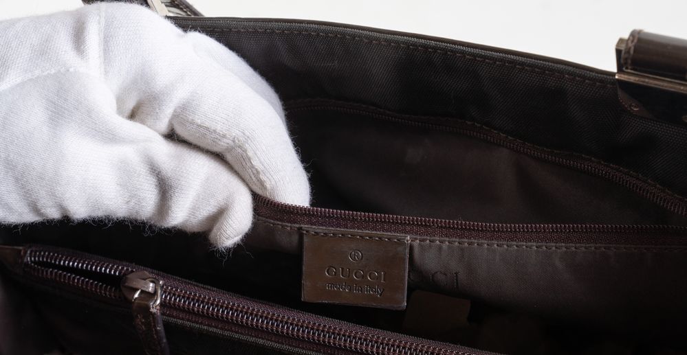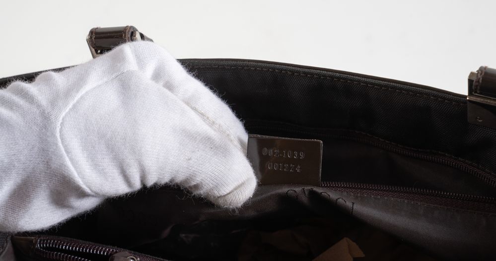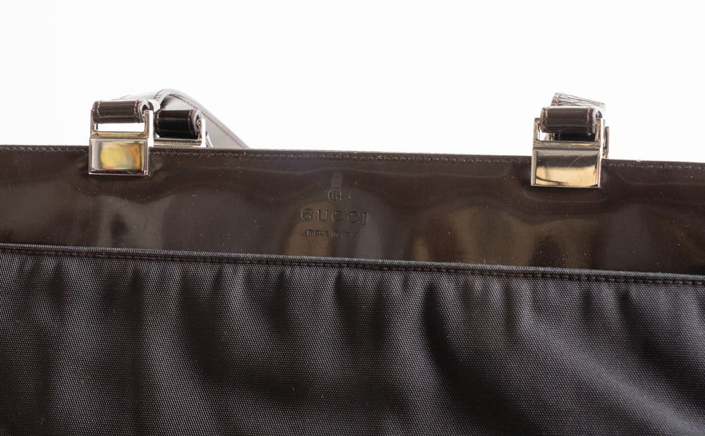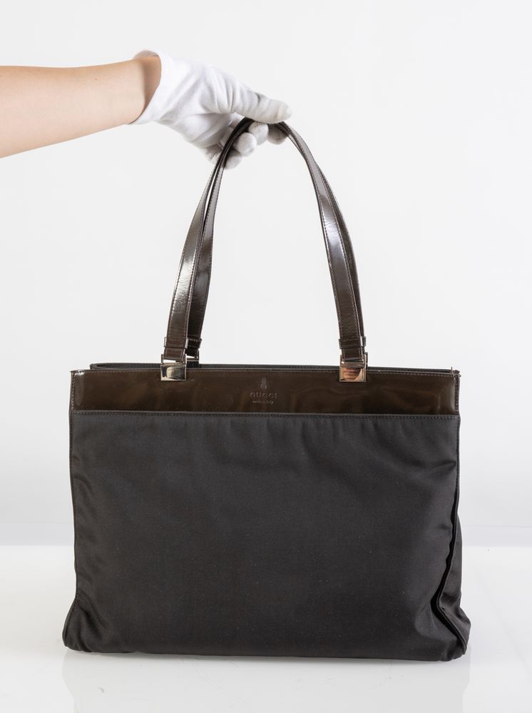 GUCCI Borsa in tela di nylon nera con dettagli in pelle verniciata marrone. Cm 29x38x13; altezza con manici cm 53. Dettagli in metallo argentato. Reca marchi Gucci Made in Italy. (lievi difetti)