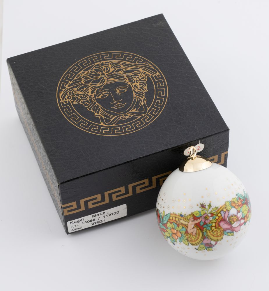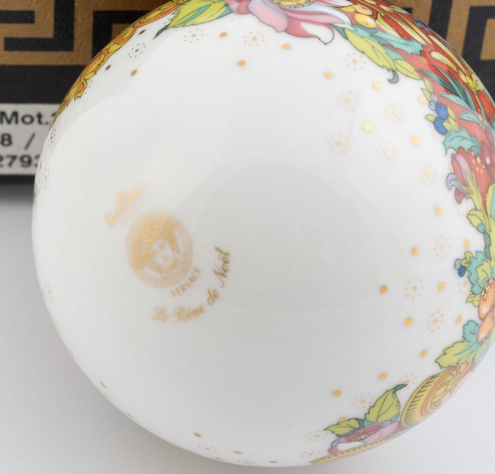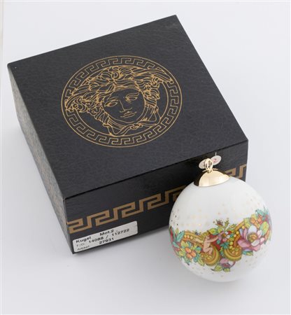 VERSACE X ROSENTHAL Decorazione natalizia in porcellana a forma di sfera dalla serie "Le Reve de Noel". Cm 8x7. Sulla base marchio Rosenthal Germany Versace, Le Reve de Noel. Corredata da scatola.