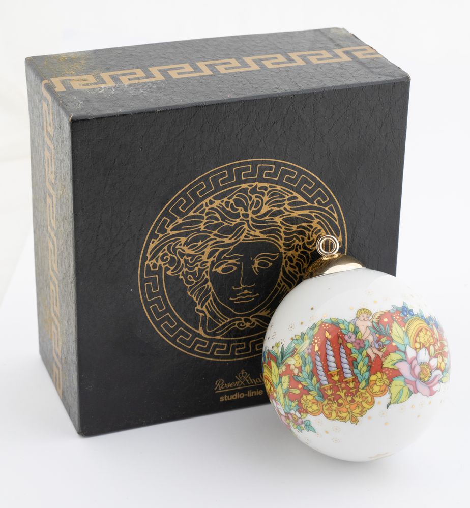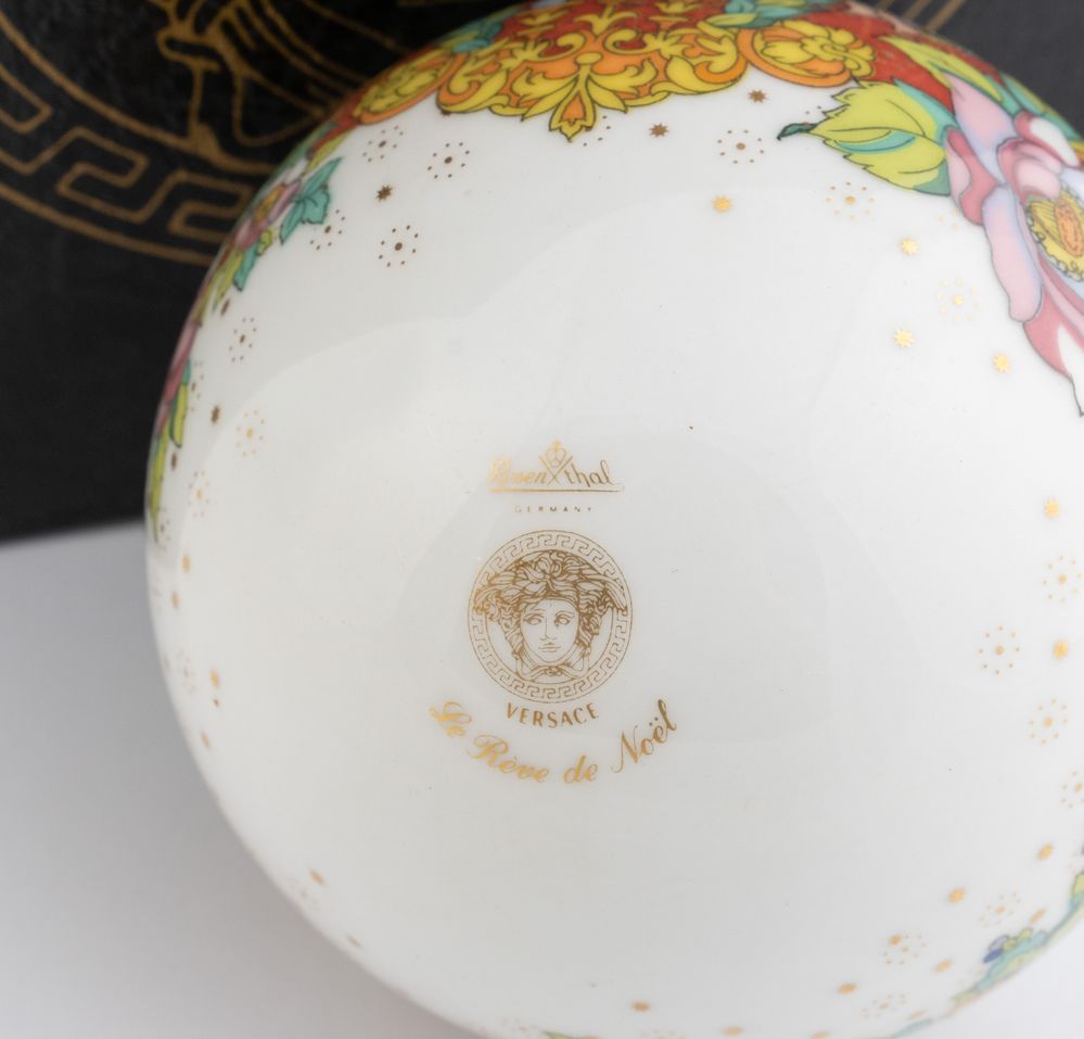 VERSACE X ROSENTHAL Decorazione natalizia in porcellana a forma di sfera dalla serie "Le Reve de Noel". Cm 8x7. Sulla base marchio Rosenthal Germany Versace, Le Reve de Noel. Corredata da scatola.