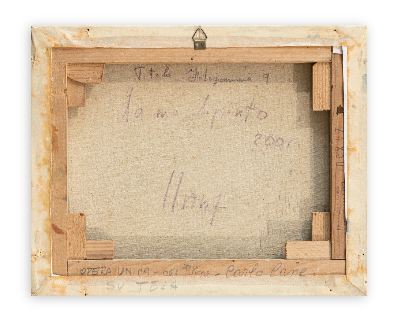 Firma, titolo, datazione e dichiarazione di autenticità dell'Artista al retro