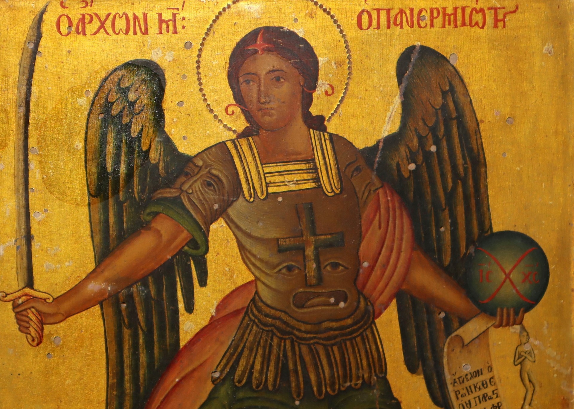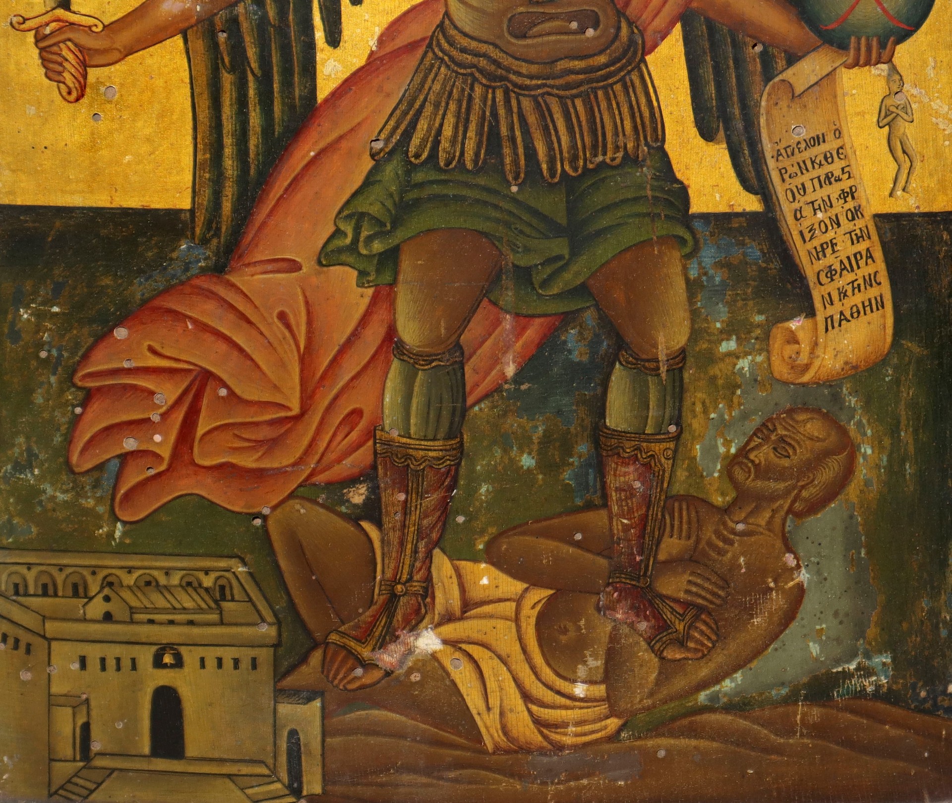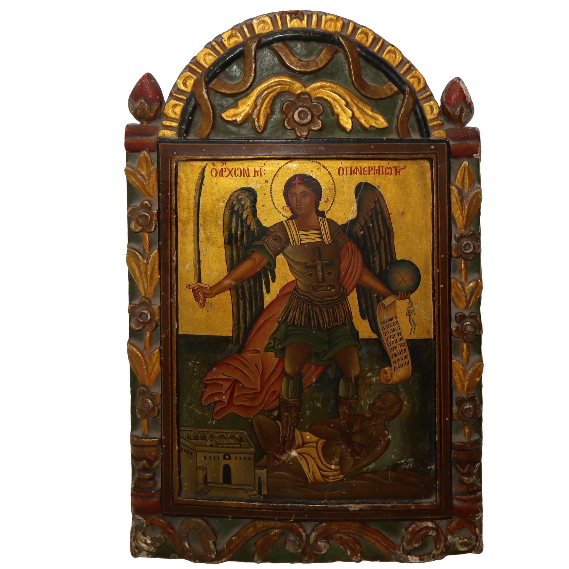 Icona Greca raffigurante San Michele, XVIII Secolo H cm 50 x 30 Oro e tempera su tavola a lunetta Intagliata ai lati a motivi floreali e a foglie