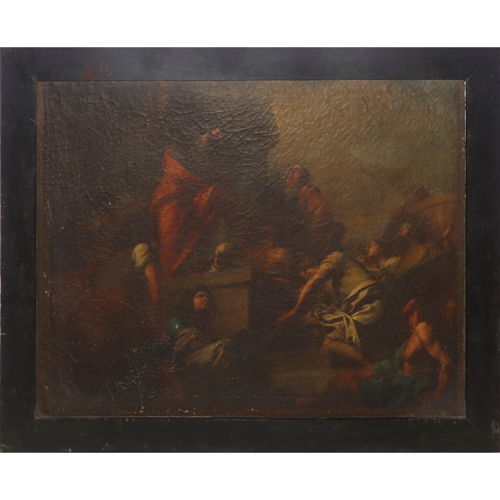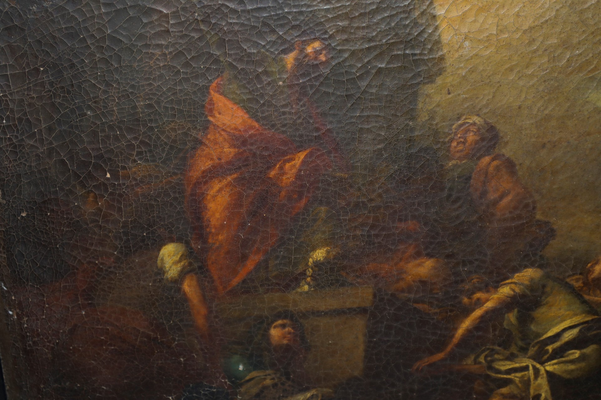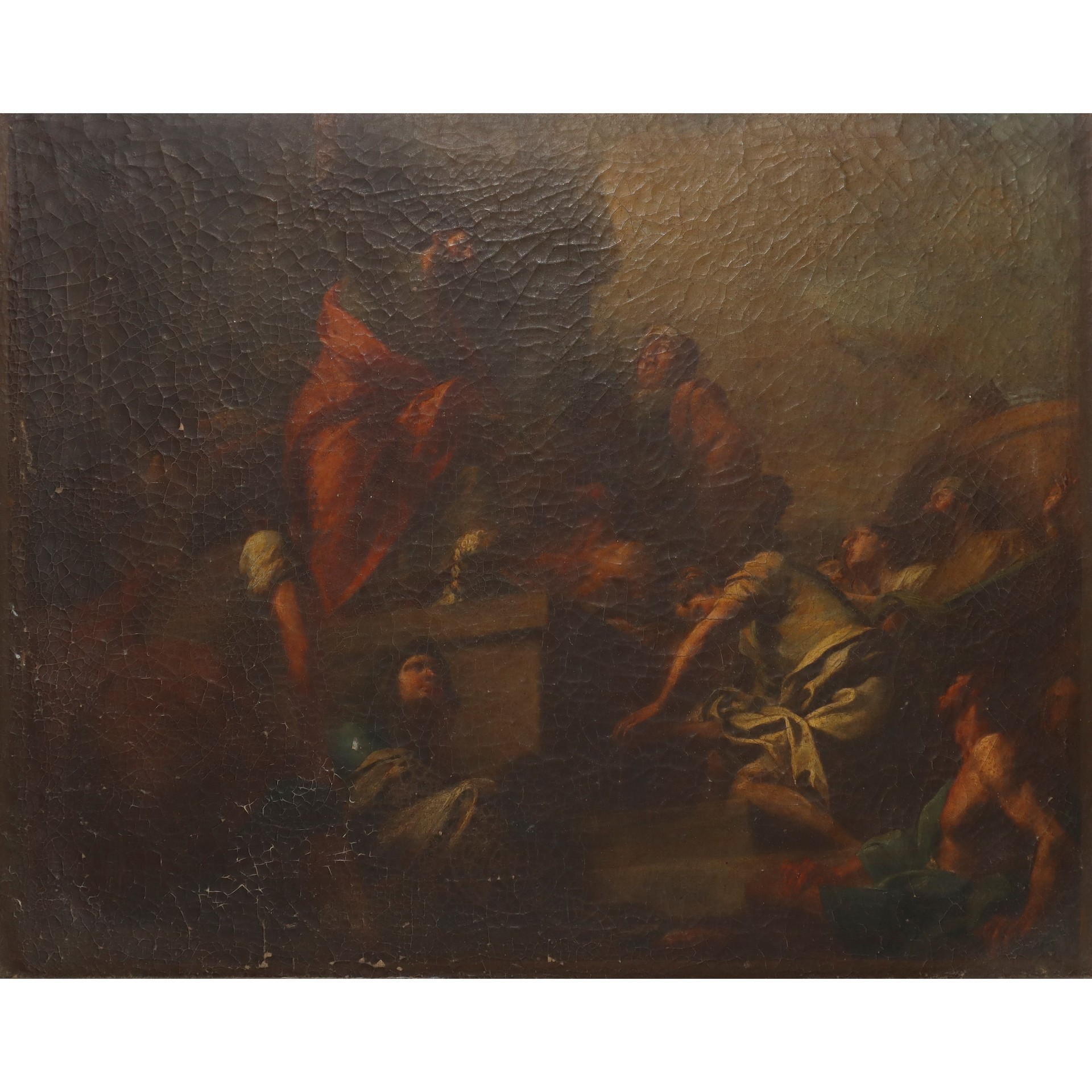 Scena Biblica, Gesù che maledice i mercanti nel tempio, 17th/18 Secolo Cm 60x74, in cornice cm 70x85 Dipinto ad olio su tela