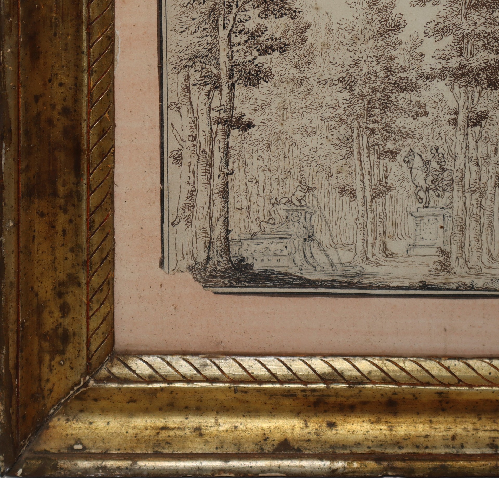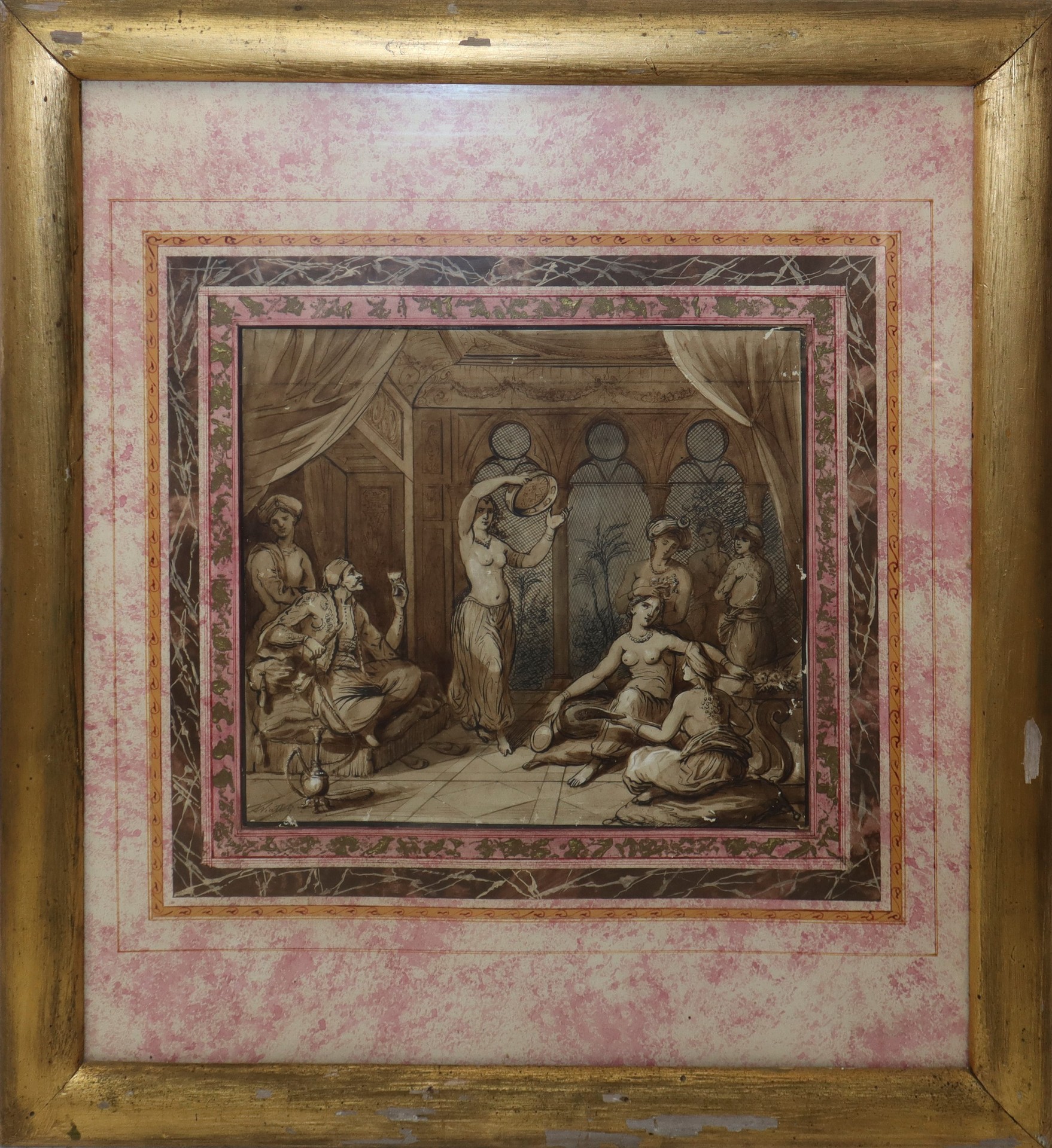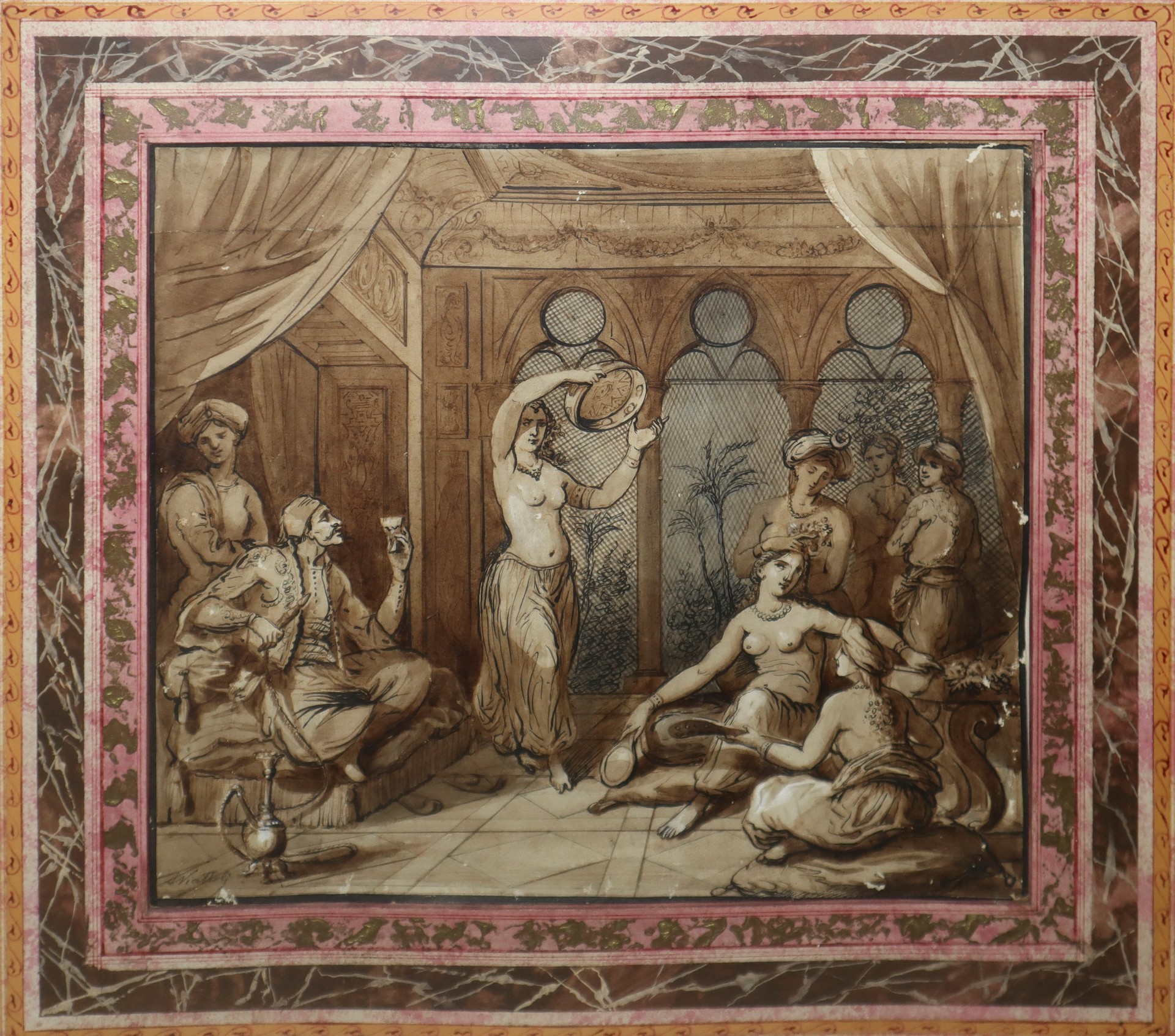 Interno di harem con donne in cornice di legno dorato, 19th/20 Secolo H cm 25,5 x 28,2 / in cornice 59 x 53 Guache colorata bruna,tecnica mista china biacca, tempera e matita Firmata in basso a sinistra