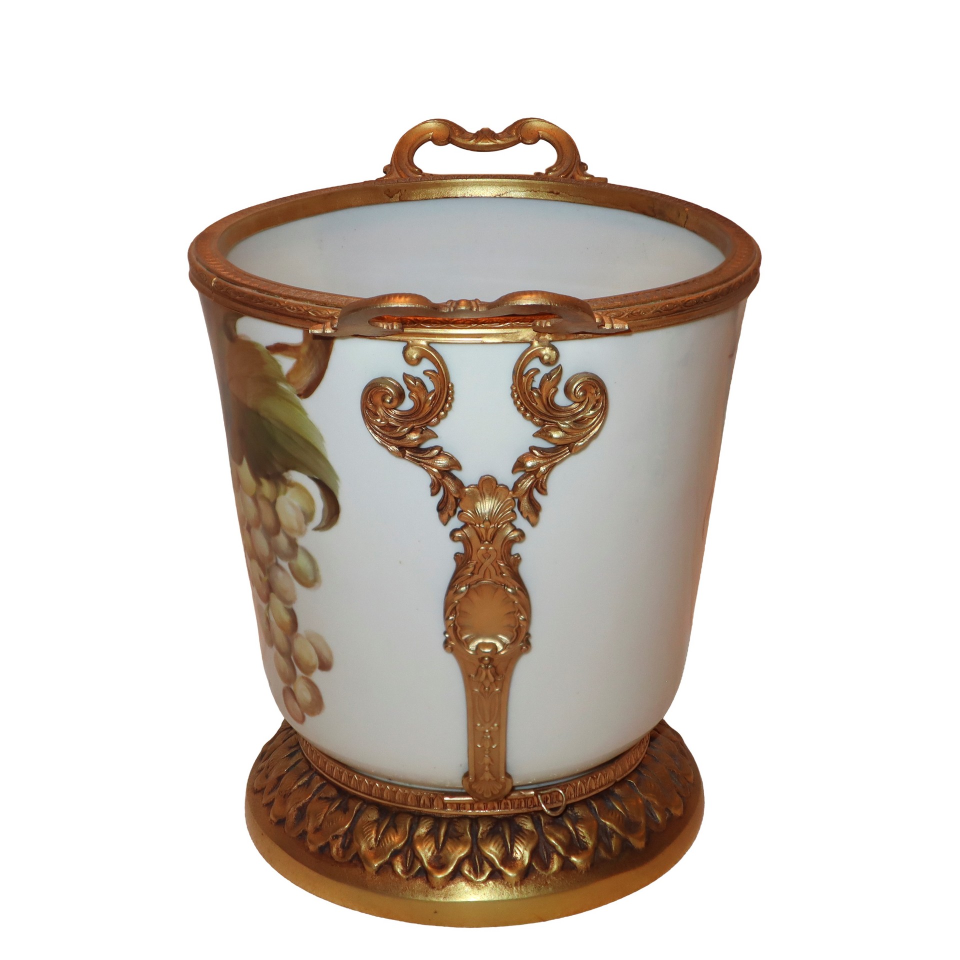 Vaso in porcellana con manici e base in metallo dorato, Empire style, 20 Secolo H cm 21, bocca 18 cm Dipinto con raffigurazioni di uva.Dipinto con raffigurazioni di uva.