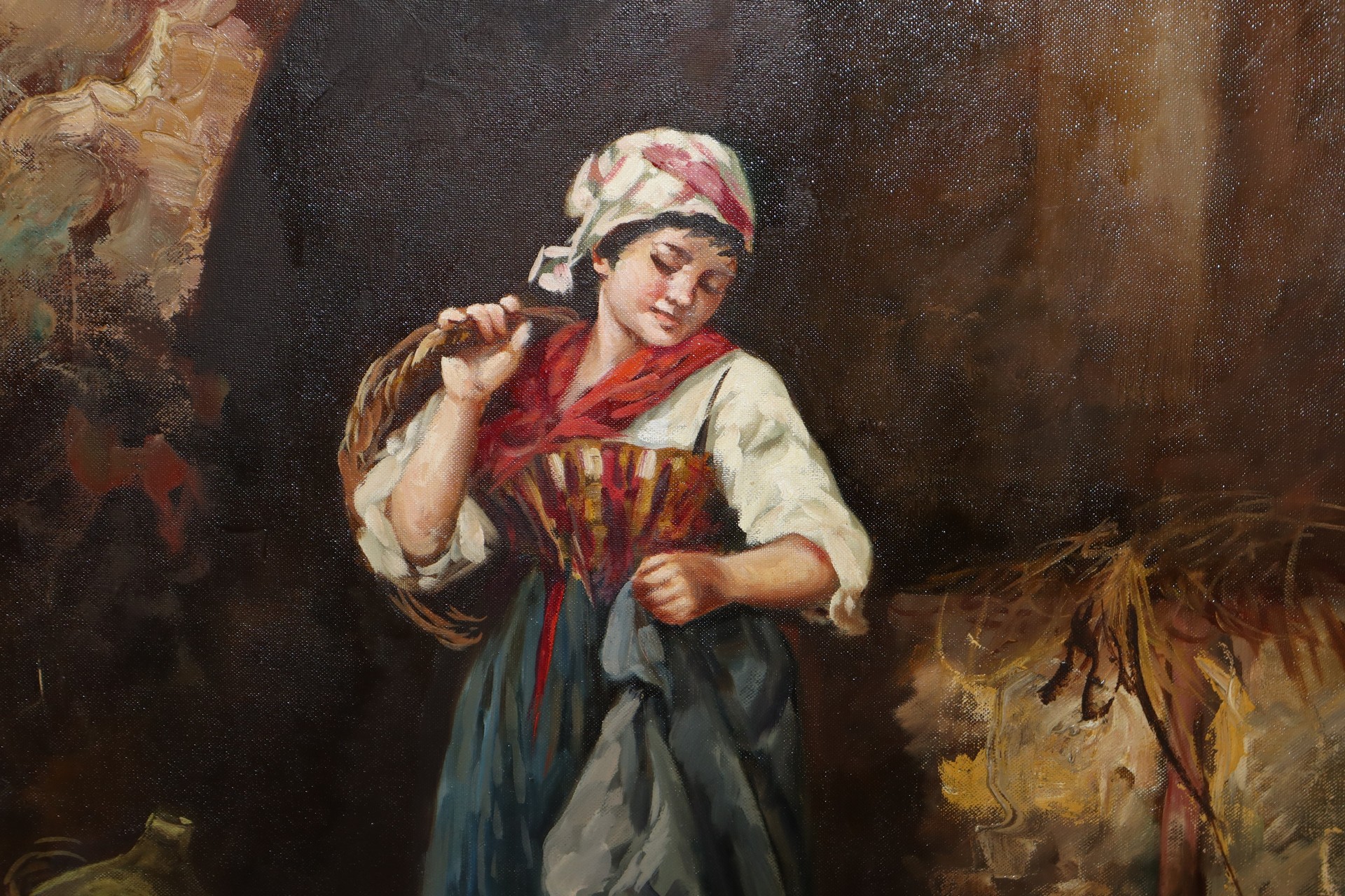 Eugenio Cecconi (Livorno 1842-Firenze 1903) - Giovane donna con pulicini H cm 80 x L 60 , in cornice H 99 x 79 Olio su tela