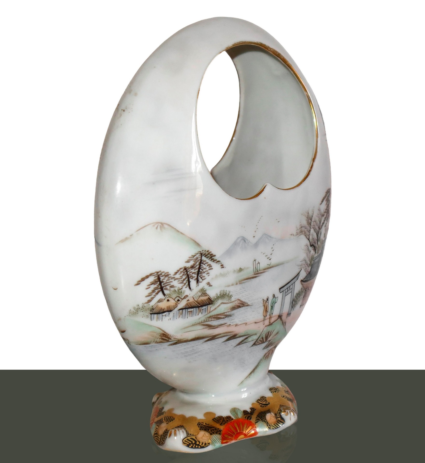 Vaso in porcellana cinese con dipinti di paesaggi su ambo i lati H cm 19.5 Base decorata in oroBase decorata in oro