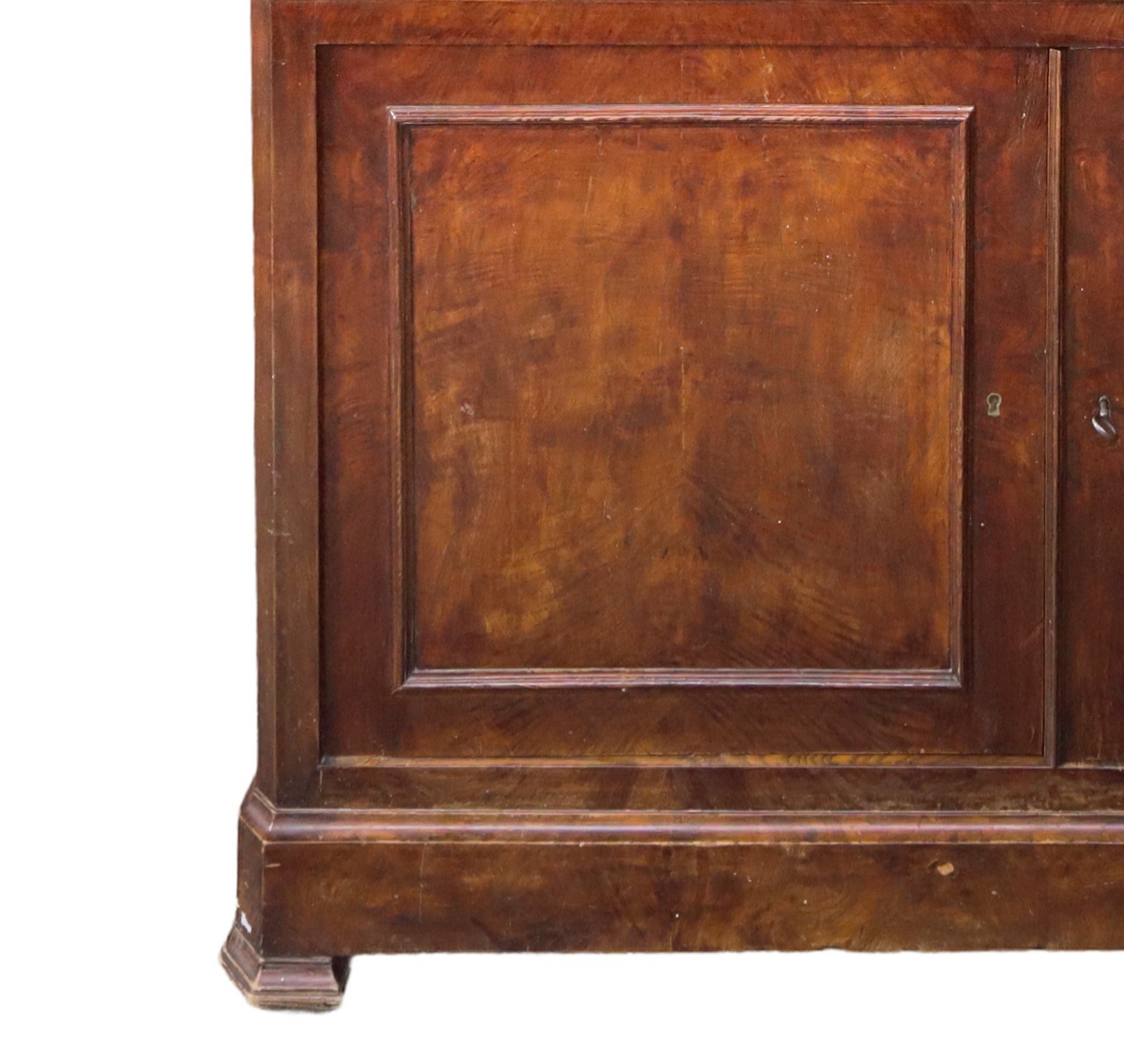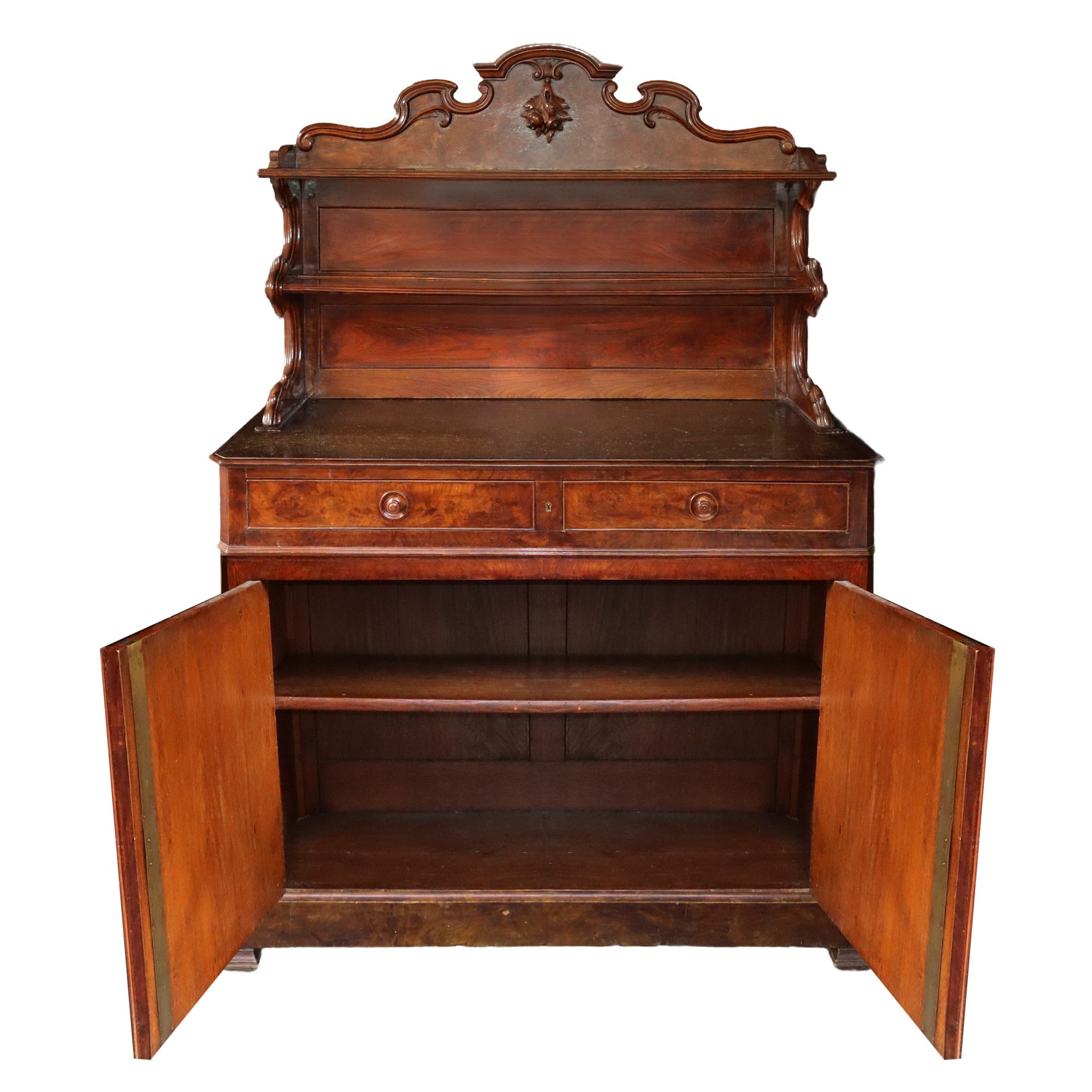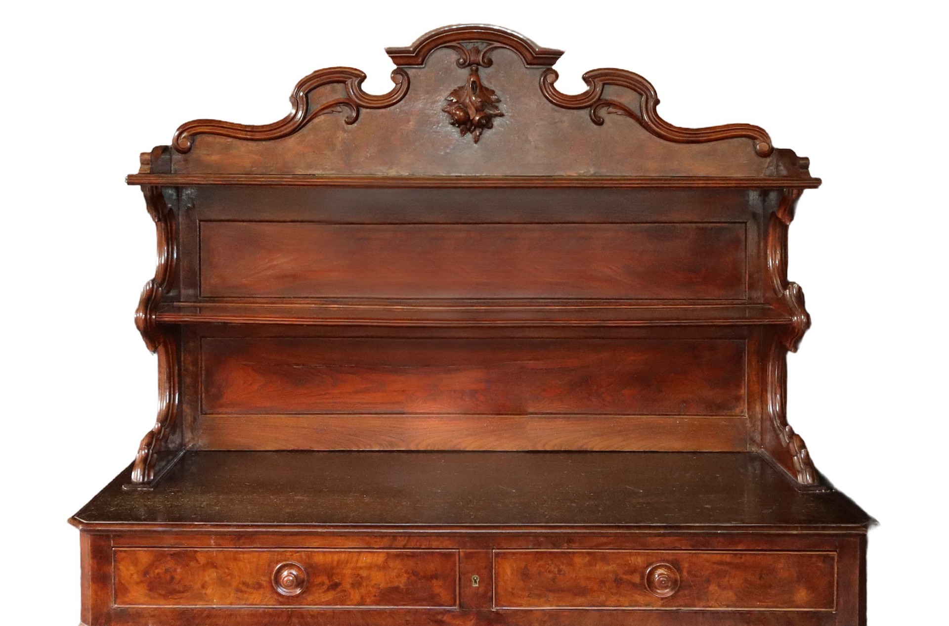 Credenza con alzata, Nineteen Secolo H cm 98 x 141 x 52 Piattaia in legno di mogano a due corpi. 2 cassetti al sottopiano e 2 sportelli per vano con mensola. Piattaia in legno di mogano a due corpi. 2 cassetti al sottopiano e 2 sportelli per vano con mensola.