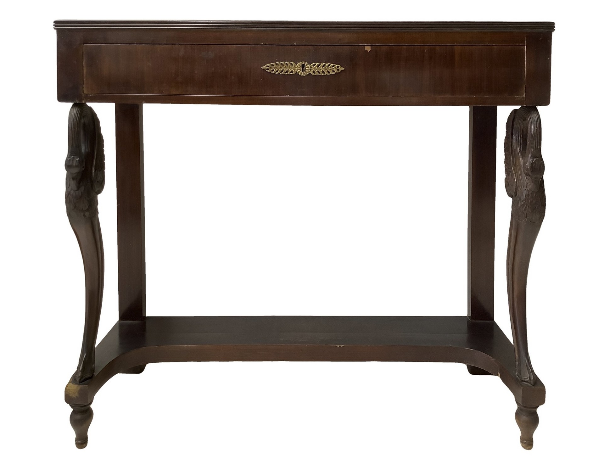 Console in legno di mogano, Nineteen Secolo h cm 85x97x33 Con marmo incassato al piano verde bardiglio e gambe anteriori a forma di cigniCon marmo incassato al piano verde bardiglio e gambe anteriori a forma di cigni