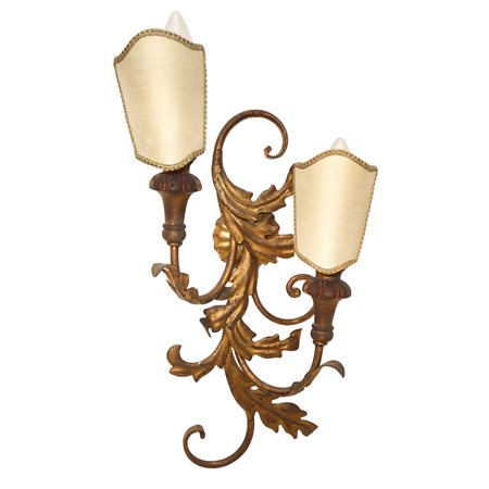 Applique a 2 luci, Early 20 Secolo h cm 47 x 24 Lavorato a mano a foglia e portacandele in legno.Lavorato a mano a foglia e portacandele in legno.