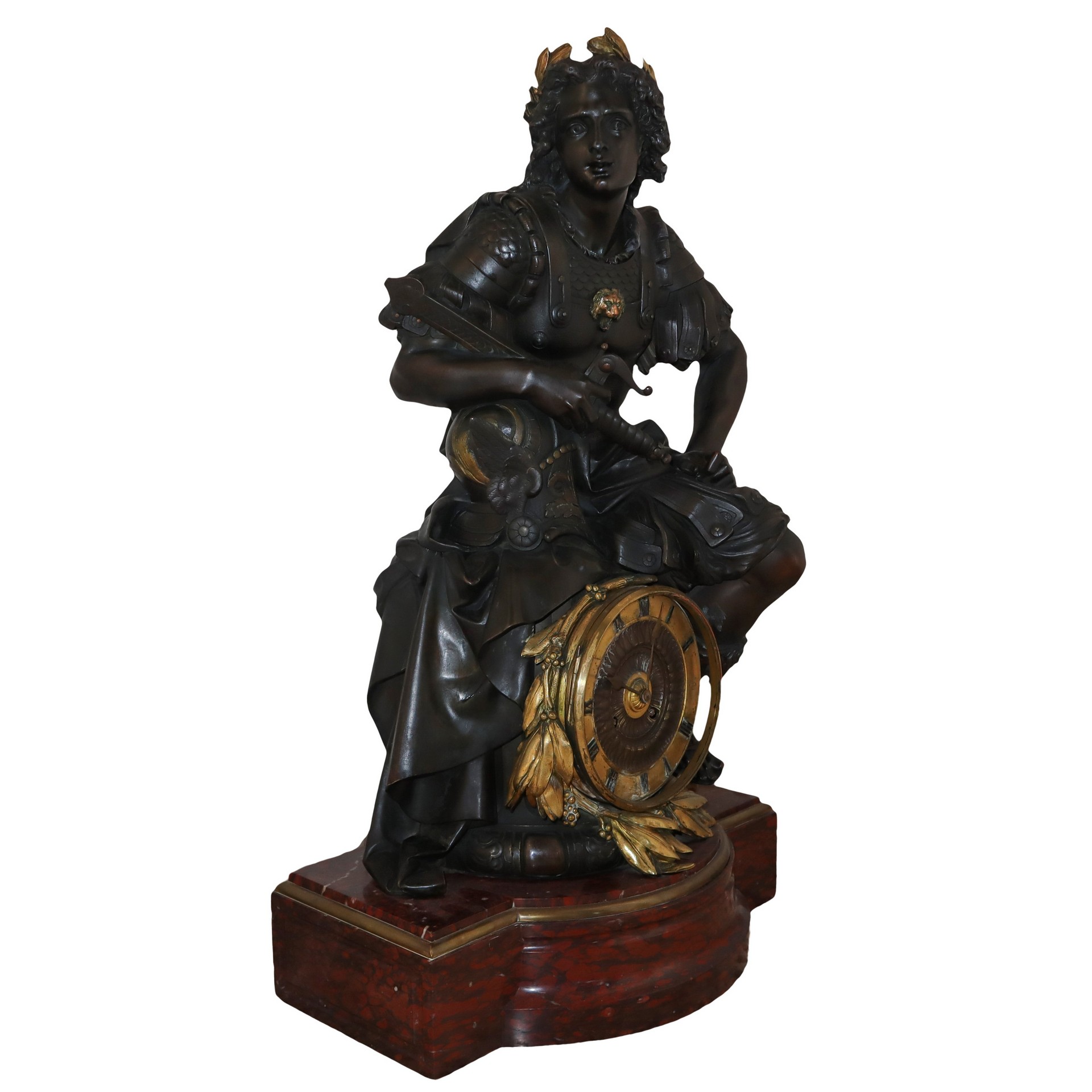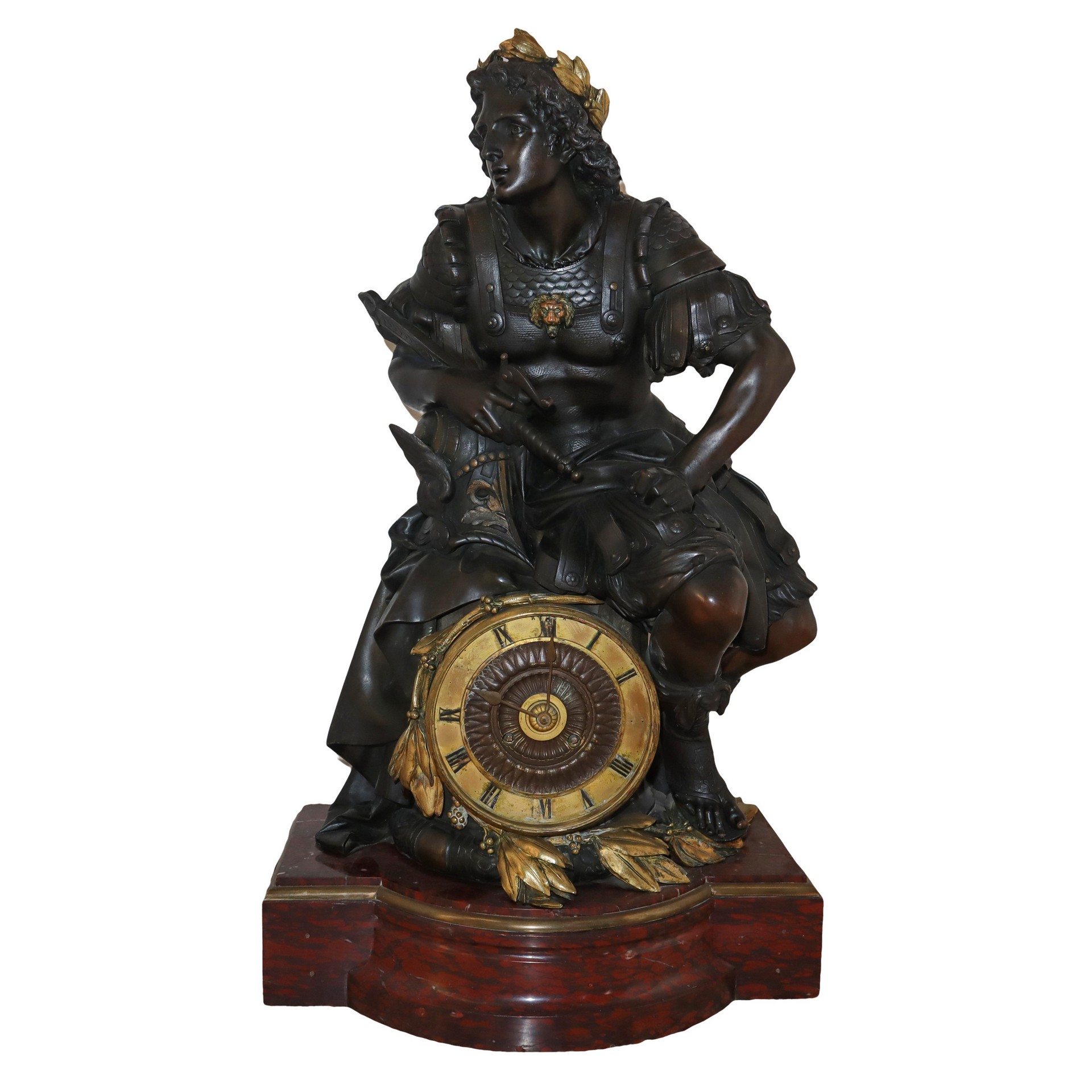 Grande bronzo patinato bruno raffigurante Alessandro Magno con orologio, 20 Secolo h cm 70x 43x30 Su base in marmo rosso sagomato. Orologio da revisionare. Su base in marmo rosso sagomato. Orologio da revisionare.
